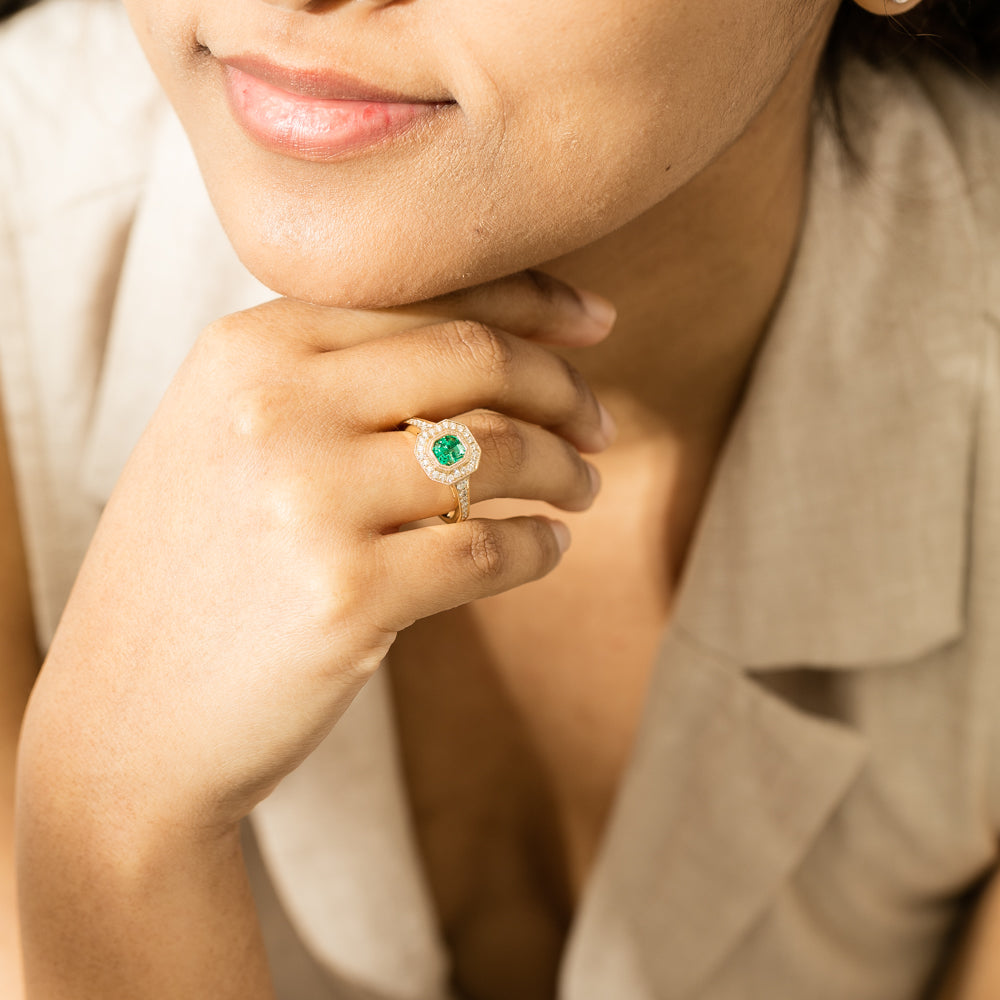Carefully crafted in 18ct yellow gold, this beautiful ring features one octagonal cut emerald set in a octagonal diamond cluster setting. This stunning emerald is framed by a halo of white diamonds and is resting on diamond set shoulders.