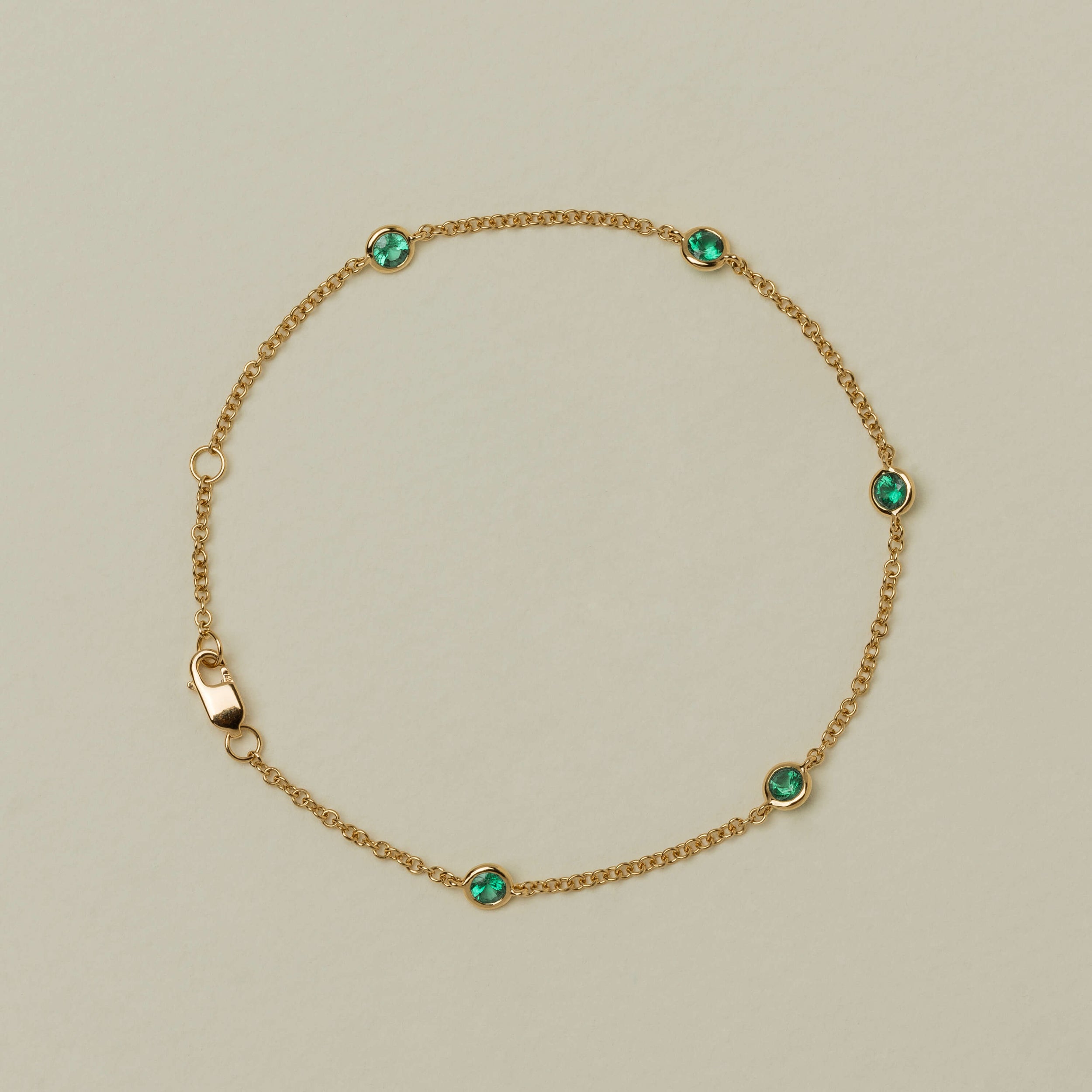 Experience the elegance of our 18ct Yellow Gold Emerald Natalia Bracelet, from our signature 1899 collection, where delicate craftsmanship meets effortless beauty. Five bezel-set emeralds are thoughtfully set along a fine 18ct yellow gold chain, each catching the light with every movement to create a sense of playful grace and freedom.