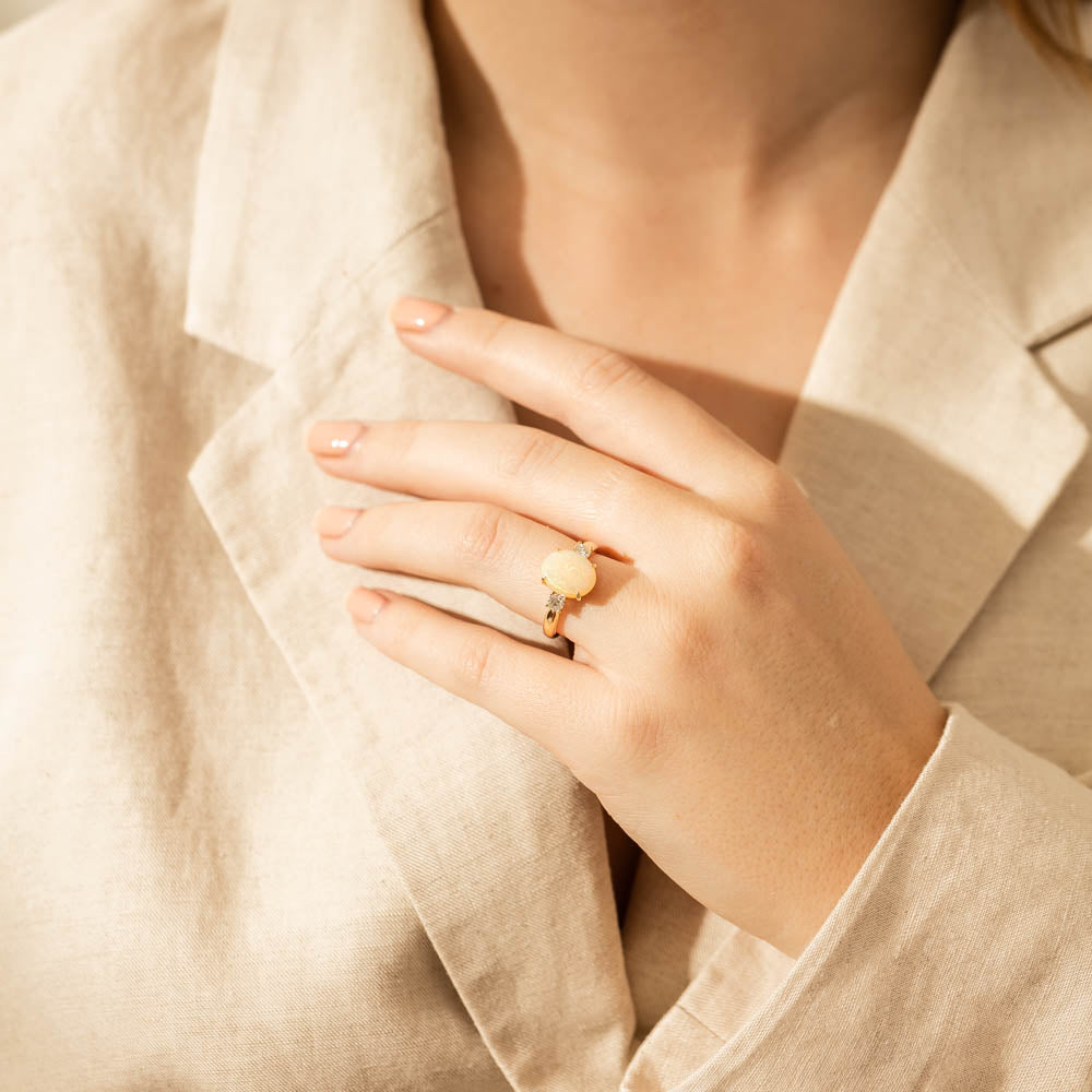 Truly breathtaking.. this striking opal & diamond ring is sure to impress! Carefully set in 18ct yellow gold, this radiant ring boasts one exquisite oval opal that consists of a play of green and orange set inside a pair of round brilliant cut diamonds.