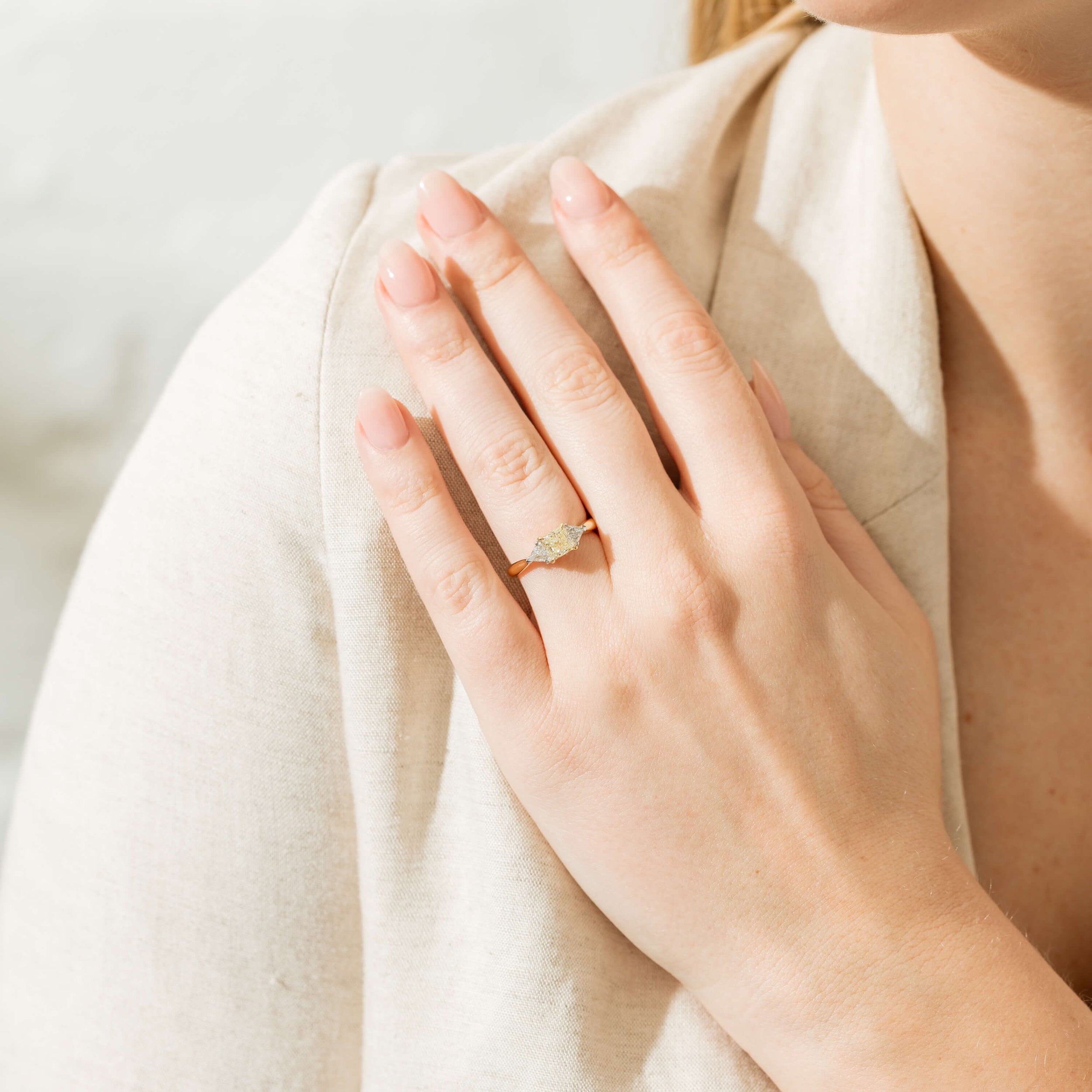 Simply radiant, this ring is sure to be the one. Beautifully crafted from 18ct yellow gold, this ring boasts a dazzling princess cut yellow diamond, framed by two trilliant cut diamonds. Make it a moment to remember.