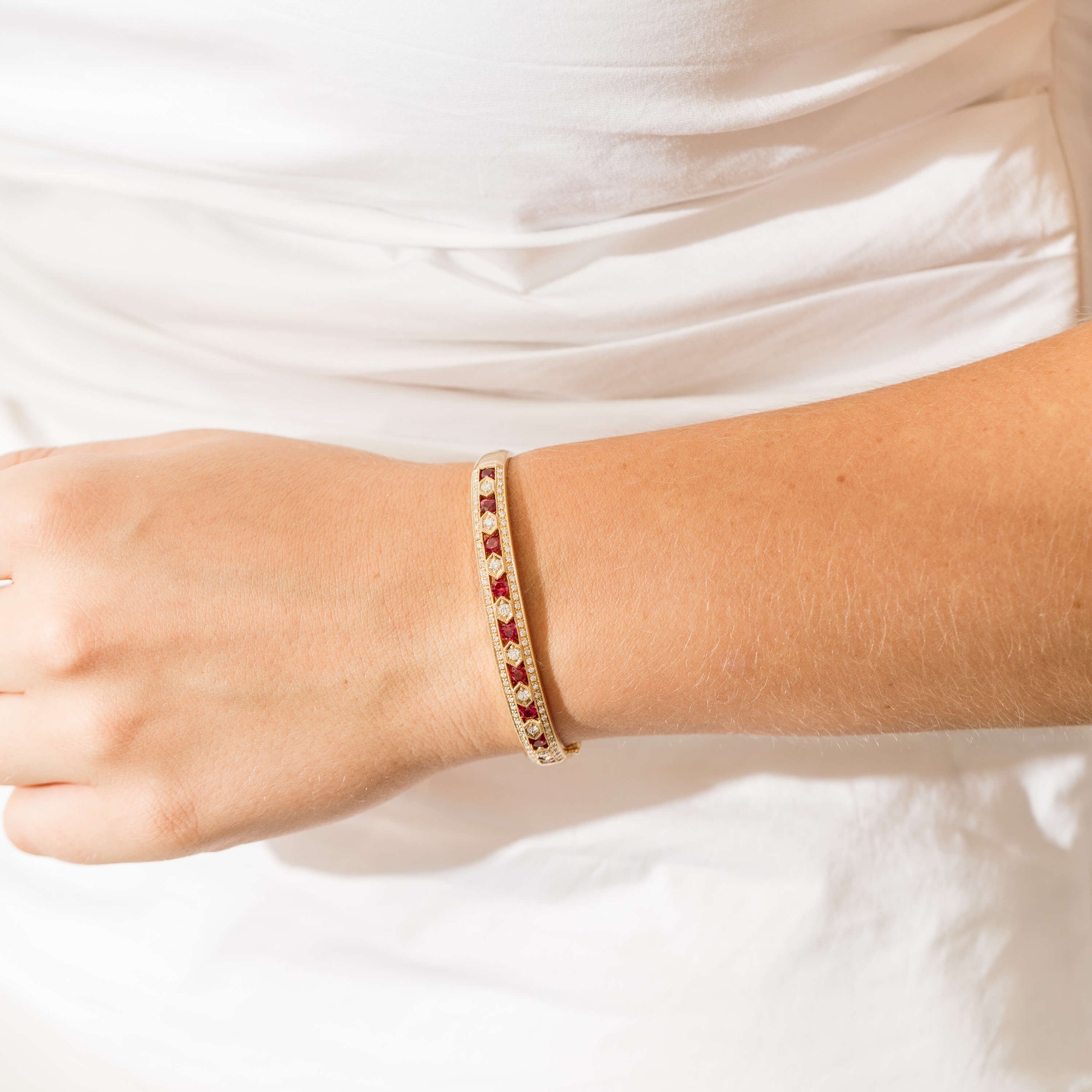 A modern look with classic timeless style, this 18ct yellow gold Cecelia bangle features 3.5mm round faceted red rubies alternating with round brilliant cut diamonds. The bangle is secured with a push in clasp and safety catches.