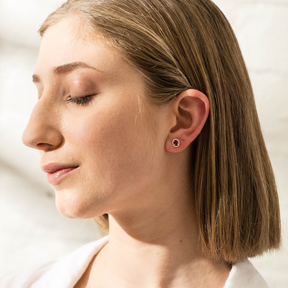 18ct Yellow Gold Oval Ruby & Diamond Halo Stud Earrings