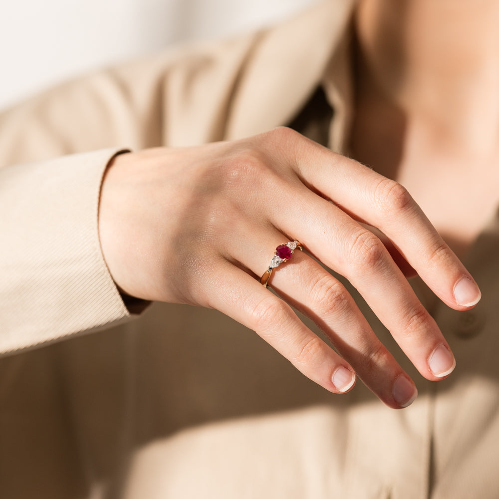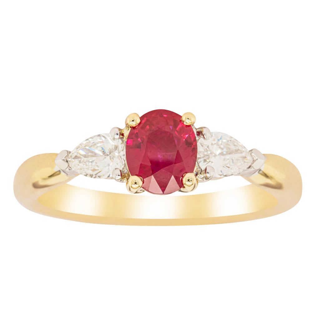 This stunning ring has been crafted from 18ct yellow gold from our signature 1899 collection, featuring an oval faceted ruby with twinkling pear cut diamonds.