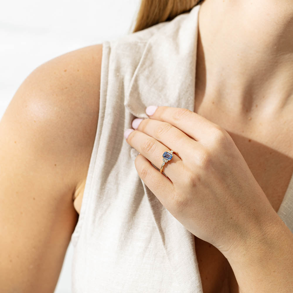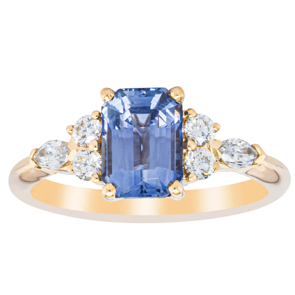 Oriana- Goddess of the dawn and love. Exuding light and crafted perfectly in 18ct yellow gold from our signature 1899 collection, this beautiful Oriana ring boasts an impressive rectangular step cut sapphire with marquise and round brilliant cut diamond set shoulders.