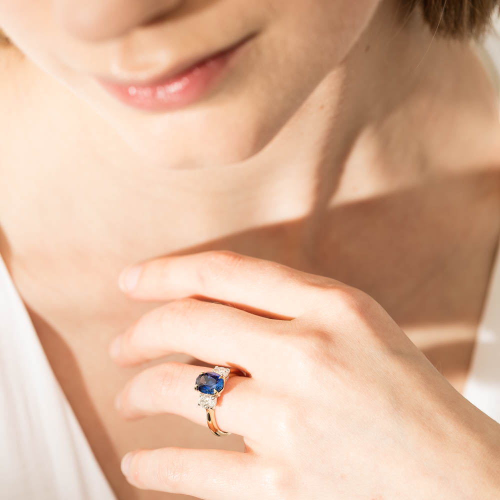 Representing your past, present and future together, this dazzling sapphire and diamond ring is sure to impress. Set in 18ct yellow gold from our signature 1899 collection, this glittering ring features an oval faceted vivid blue sapphire and two sparkling oval brilliant cut diamonds. Elegant & timeless!