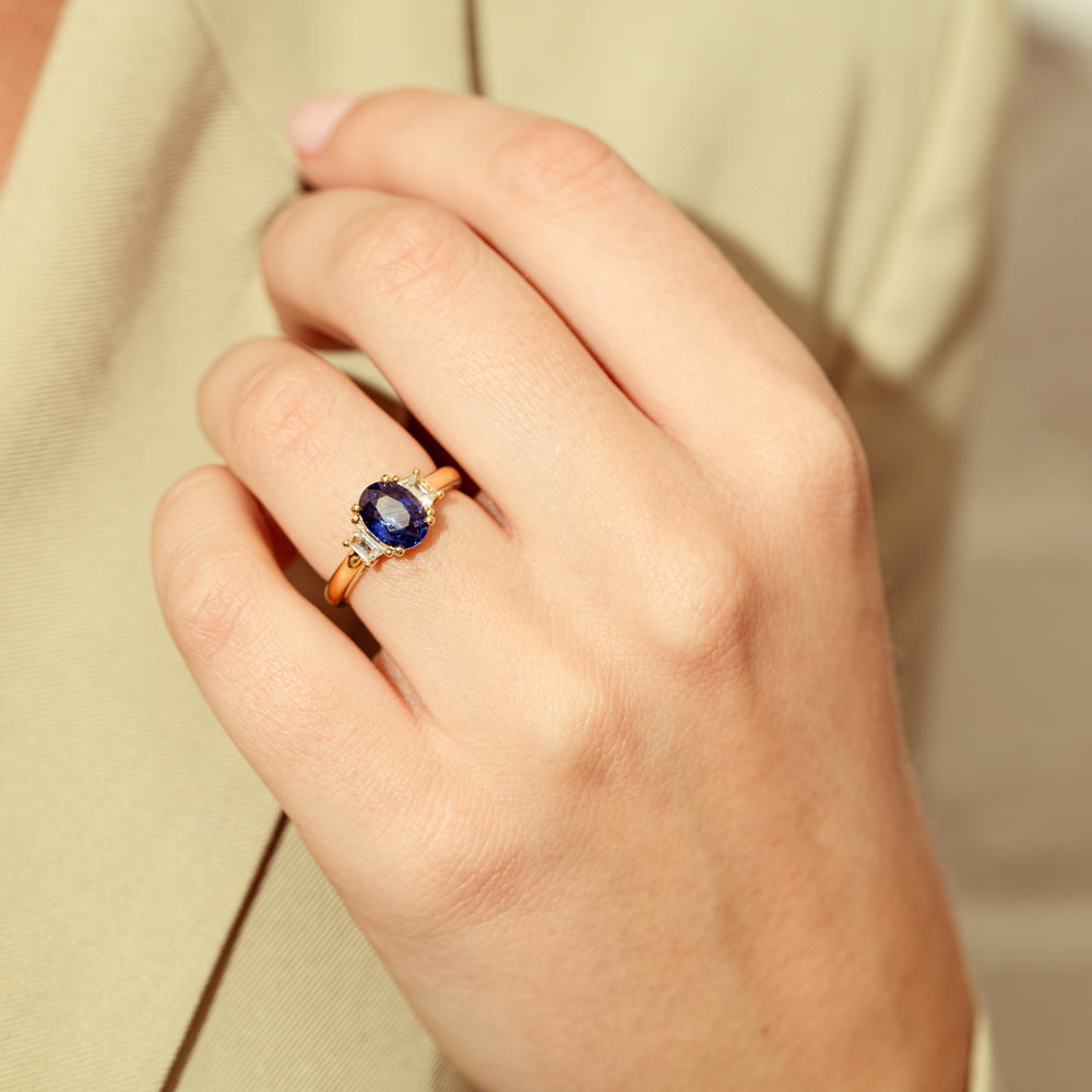18ct Yellow Gold Oval Sapphire & Step Cut Diamond Ring