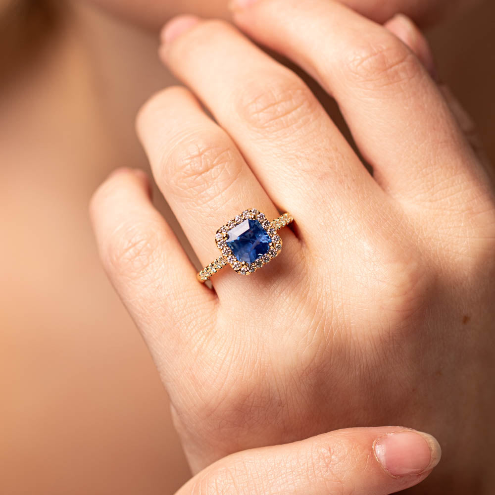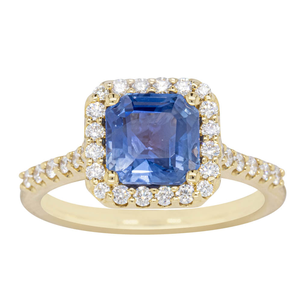 A timeless classic, you will cherish this elegant sapphire and diamond ring. This piece boasts a strong blue sapphire with a diamond halo and is carefully set in 18ct yellow gold from our signature 1899 collection.