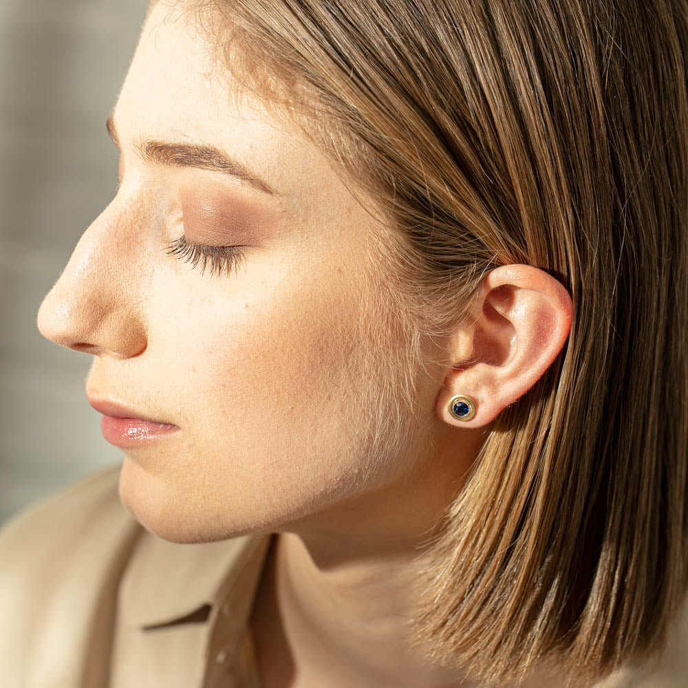 Glisten in these sophisticated sapphire Windsor studs. Crafted in luxurious 18ct yellow gold from our signature 1899 collection, this dazzling duo boasts two round faceted blue sapphires, satin finished in a circular mount with millgrain setting. You will never want to take them off!