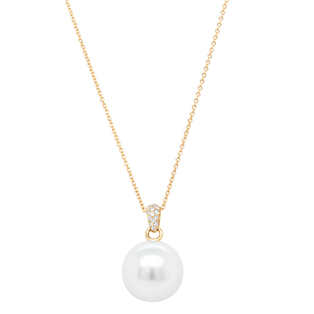 Stand out wearing this sparkling pearl and diamond pendant! Crafted from beautiful 18ct yellow gold this breathtaking piece features a peg set south sea pearl which swings from a diamond set bail. You are sure to receive many compliments wearing this magnificent piece. So go on, Treat yourself!
