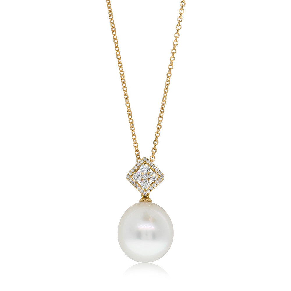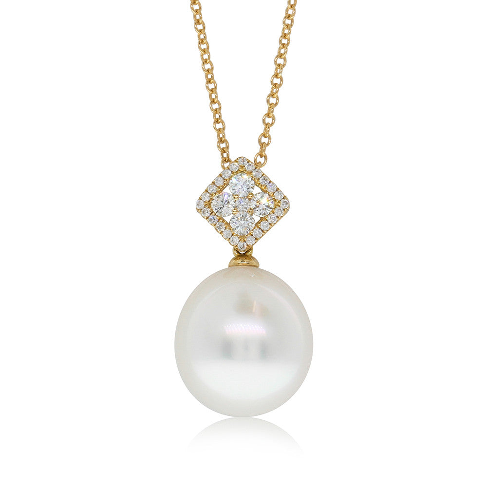 Dazzle her with this shining South Sea pearl and diamond pendant. This elegant pendant has been crafted in 18ct yellow gold and features a glimmering white pearl and round brilliant cut diamonds.