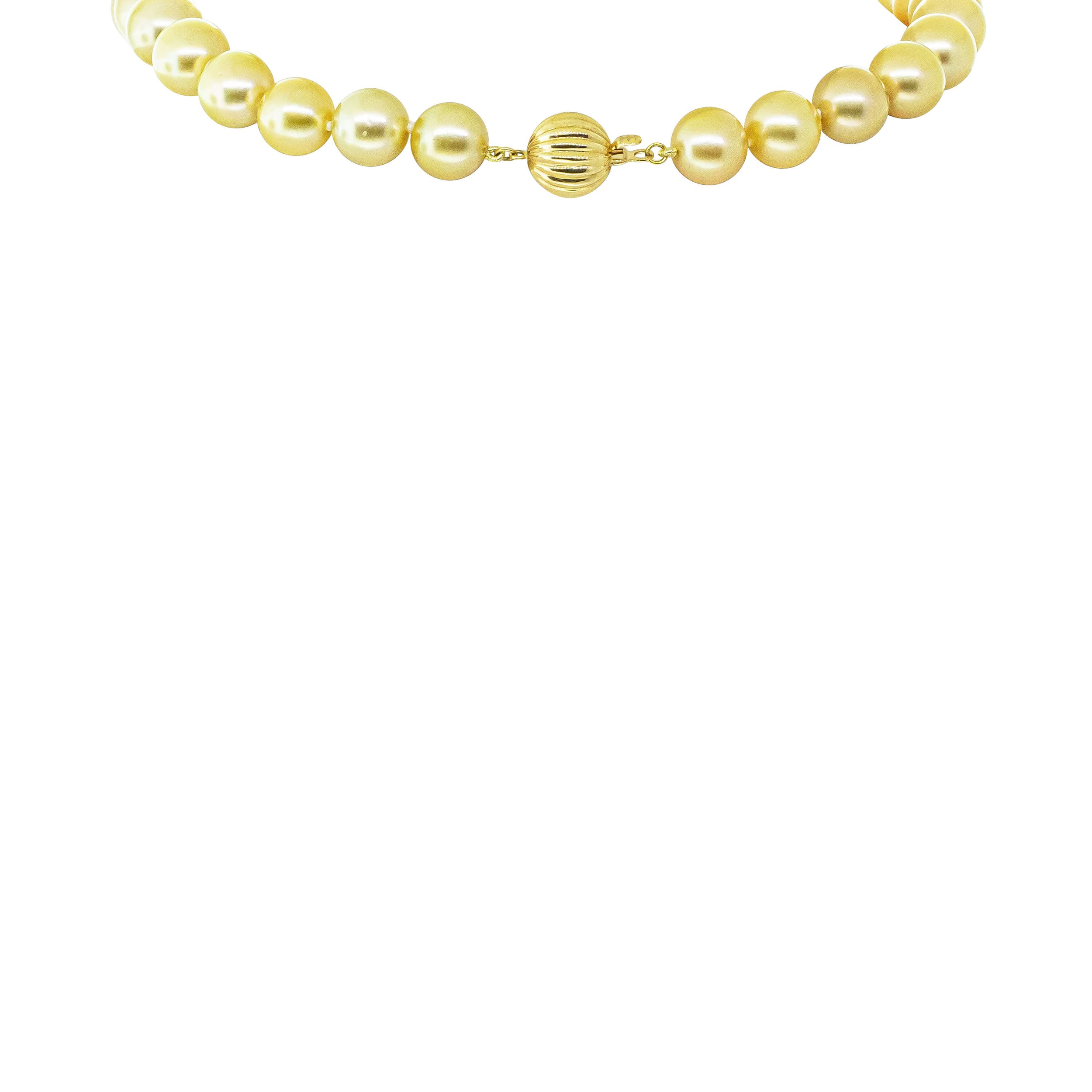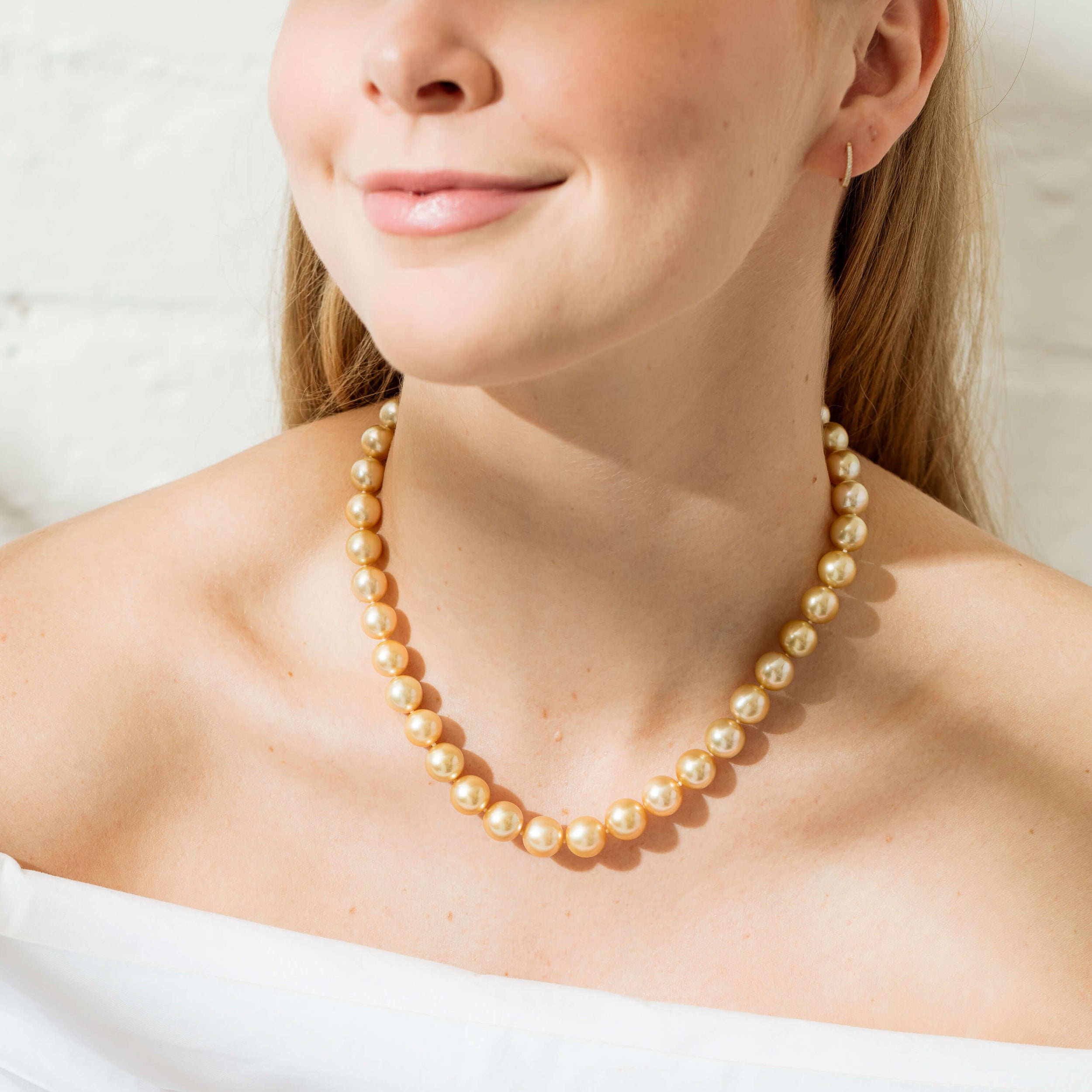 Treat yourself to this beautiful golden south sea pearl necklace. Individually knotted and secured with an 18ct yellow gold clasp, these precious graduated pearls are the picture of elegance.