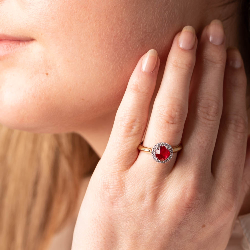 Embody sophistication in this timeless ruby and diamond eclipse ring. This striking ring boasts a bright red ruby framed by a sparkling diamond halo, set in 18ct yellow and white gold. An elegant ring that you will adore.