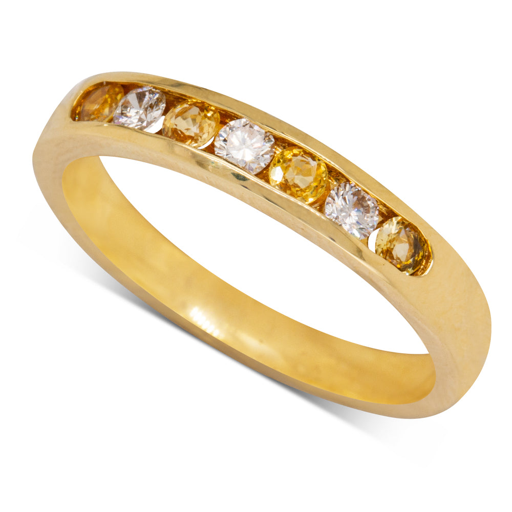Spoil yourself with this shining sapphire and diamond band. Carefully crafted in 18ct yellow gold, this unique ring features shining yellow sapphires and twinkling diamonds.