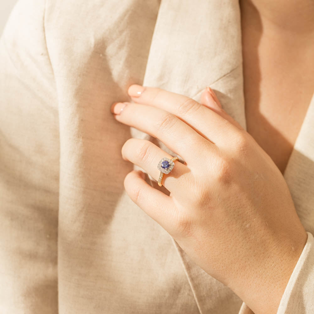 Surprise her with sparkles! This glistening ring boasts one round faceted tanzanite, framed by a glittering diamond halo. Further diamonds are set along the 18ct yellow gold band. She will adore it forever.