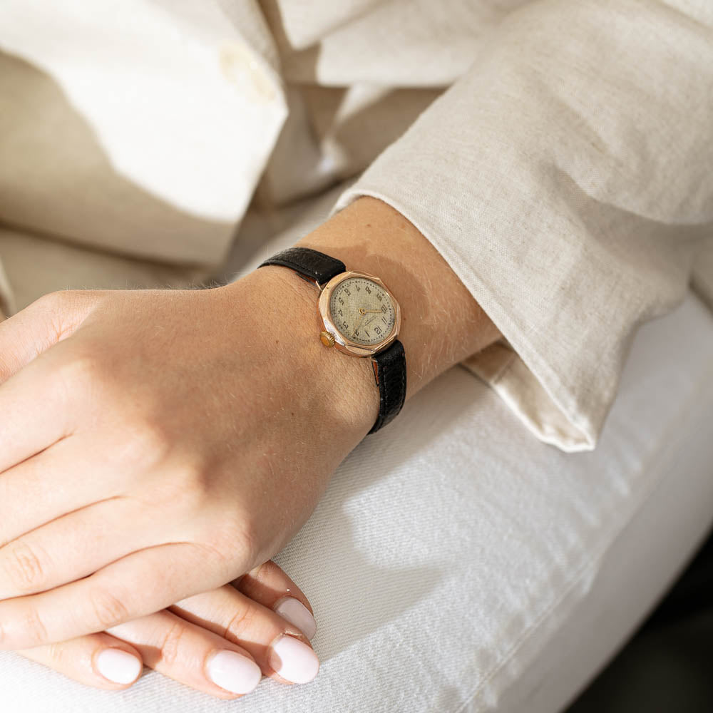 This Vintage 9ct Rose Gold Rotherhams Ladies Watch is a collector's item, crafted with 9ct rose gold and a matt cream dial featuring Arabic numerals. The wristband has been replaced with a genuine black leather bracelet, perfect for everyday wear.
