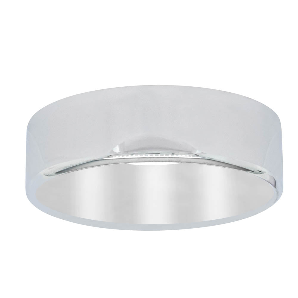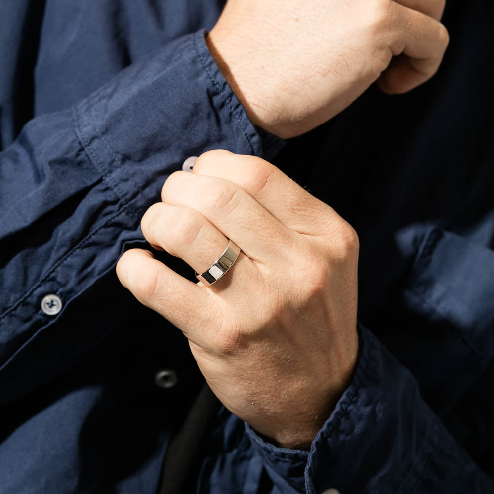 This 9ct white gold ring is 7mm wide and has a square profile edge. Available in a standard polished finish (as pictured) or brushed.