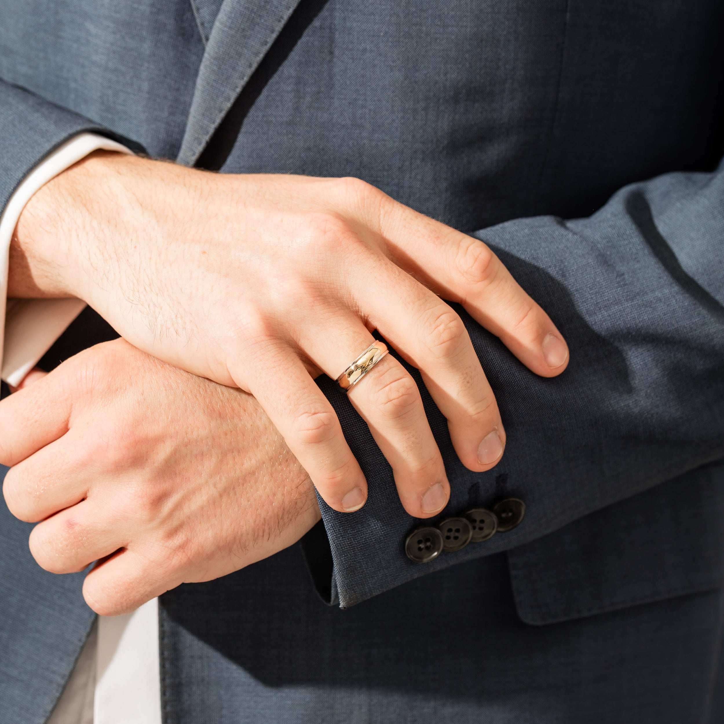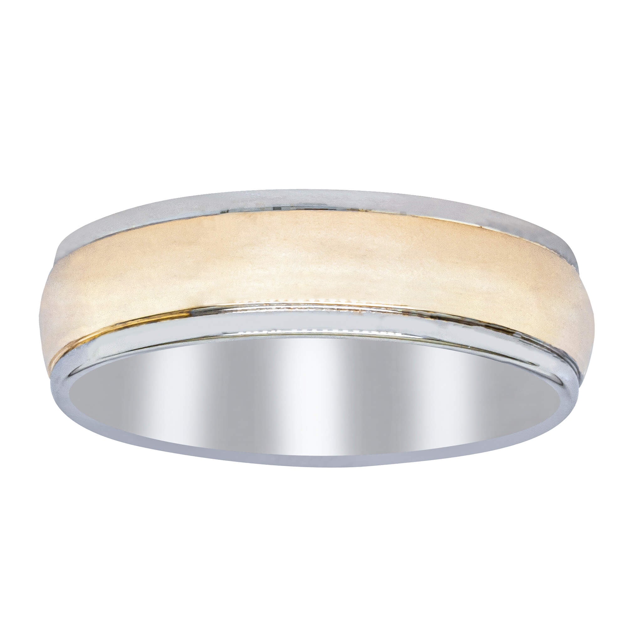 This 9ct white and yellow gold ring is 6mm wide and has a patterned design. The ring has a standard polished finish, features both white and yellow gold. Expertly crafted and versatile!