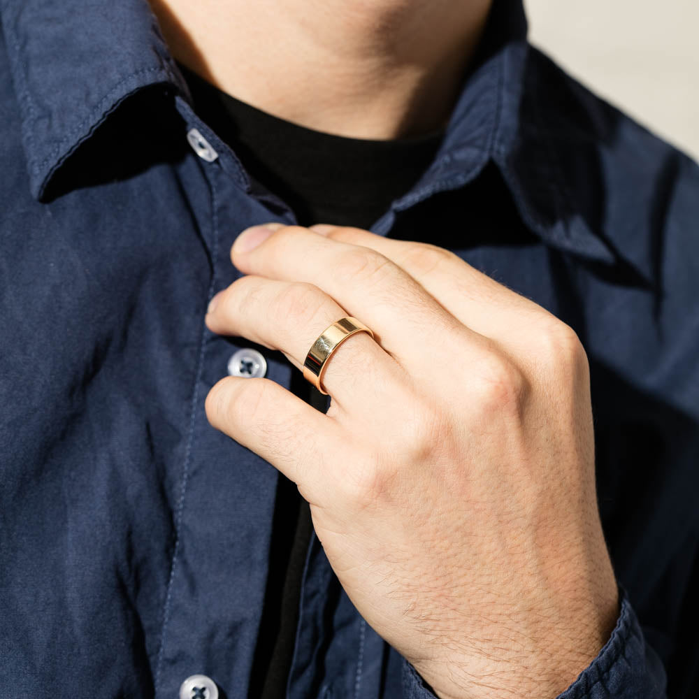 This 9ct yellow gold ring features a 6mm wide band with a contemporary square profile edge, offering a bold and timeless look. Available with either a polished finish for classic shine or a brushed finish for a modern twist, this versatile band is perfect.