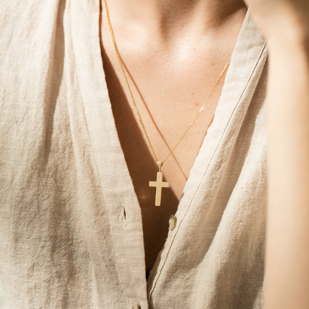A beautiful, simple cross will make a lovely gift on that special occasion or a perfect investment piece for yourself. The 9ct yellow gold cross pendant is a medium size, has a square profile and rests on a yellow gold curb chain. This gorgeous piece is perfect for the minimalist that loves to add just the right amount of shine to every outfit.