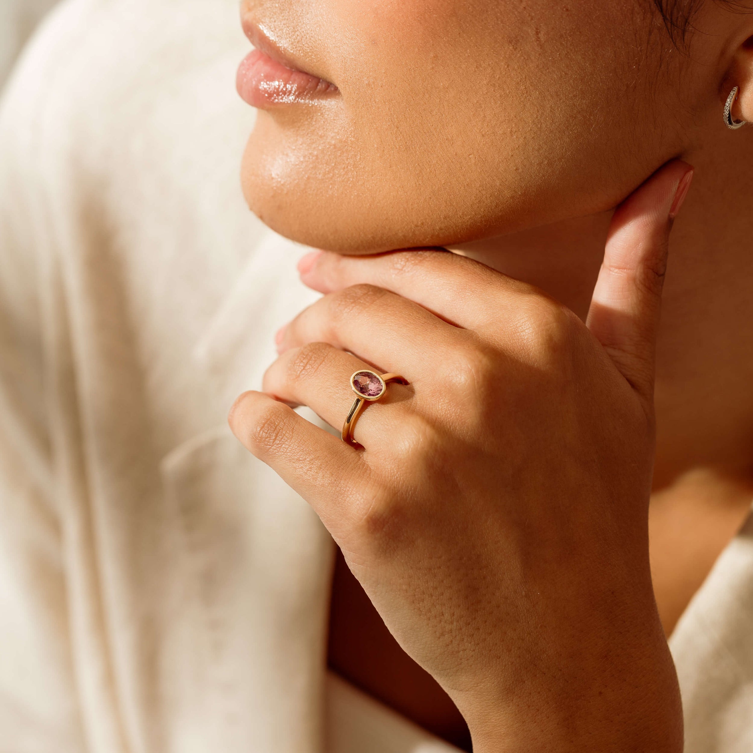 Fresh, vibrant, and effortlessly elegant, the 9ct Yellow Gold Pink Tourmaline Rubover Set Ring showcases a stunning oval-cut pink tourmaline in a smooth rubover setting. The rich yellow gold band beautifully frames the pink gemstone, enhancing its brilliance. This ring’s sleek lines and bold colour make it a timeless statement—perfect for those seeking a touch of cheerful sophistication in collection.