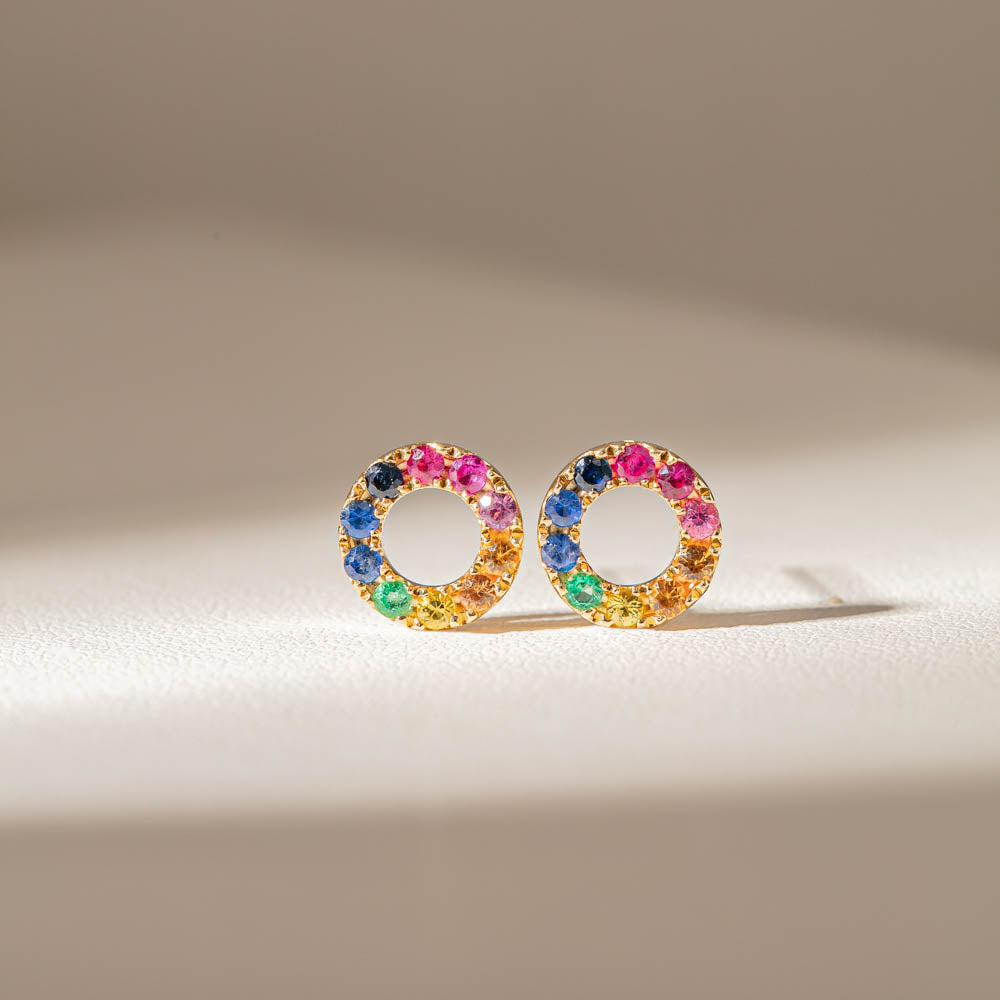 Bursting with colour, these divine petite stud earrings boast an array of natural sapphires, emeralds and rubies set in luxurious 9ct yellow gold.