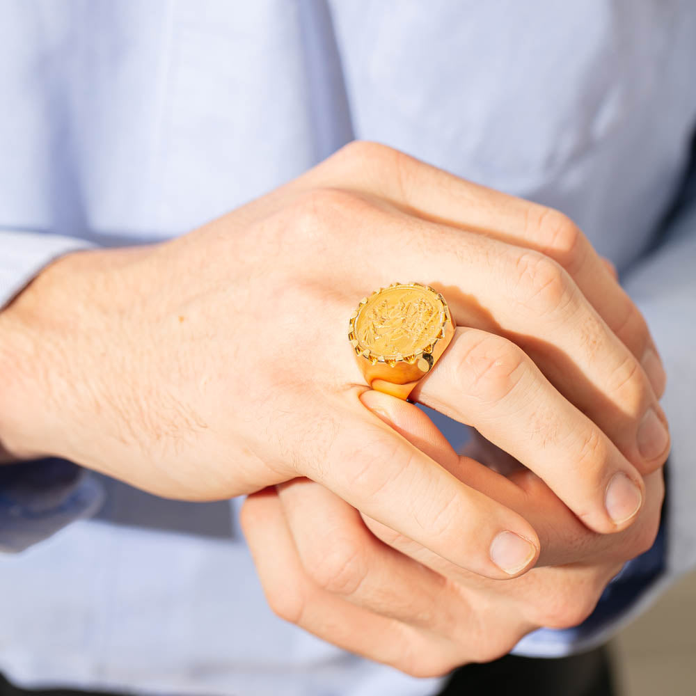 Treat yourself to this stylish gold sovereign ring. Crafted in 9ct yellow gold, this bold rings features a sovereign coin in a claw setting. This timeless piece exudes luxury. A statement piece you will love wearing everyday.