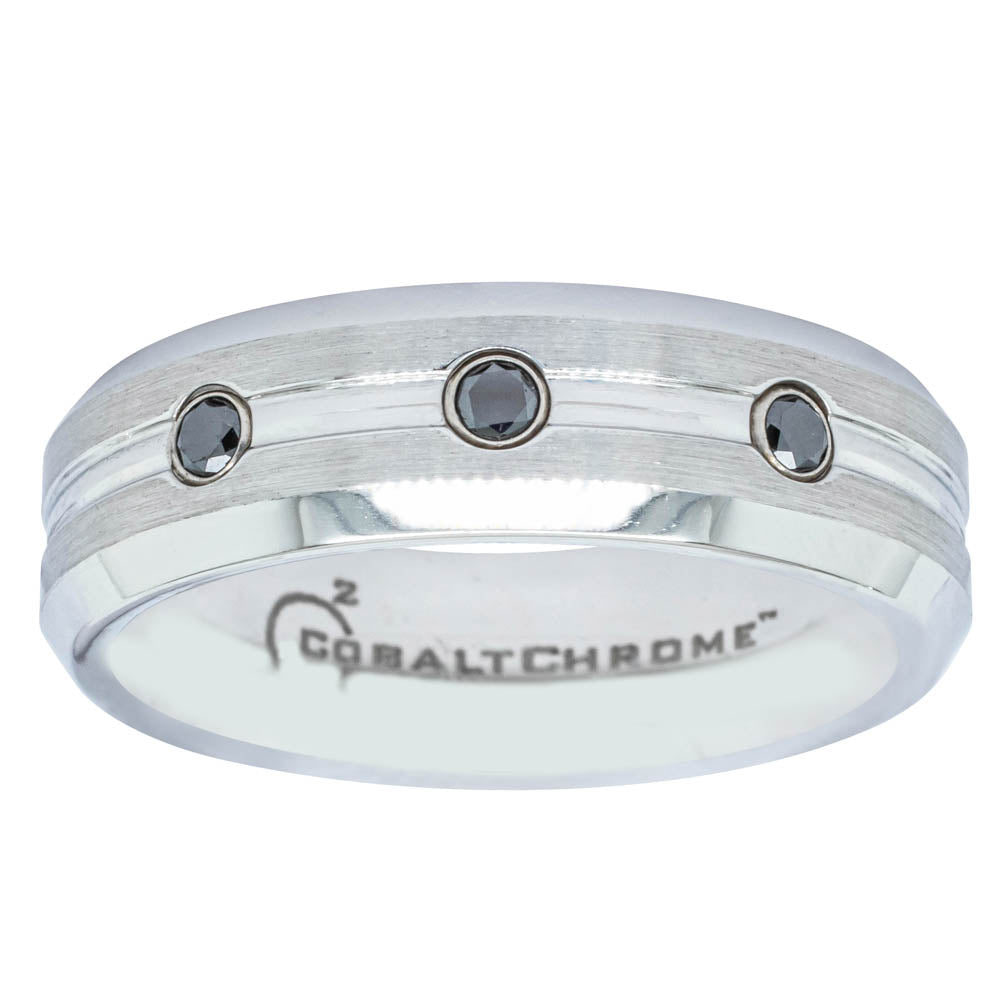 This Cobalt satin-finish 7.5mm comfort-fit band features a polished beveled edge and centre. It has three round brilliant cut black diamonds set through the centre.