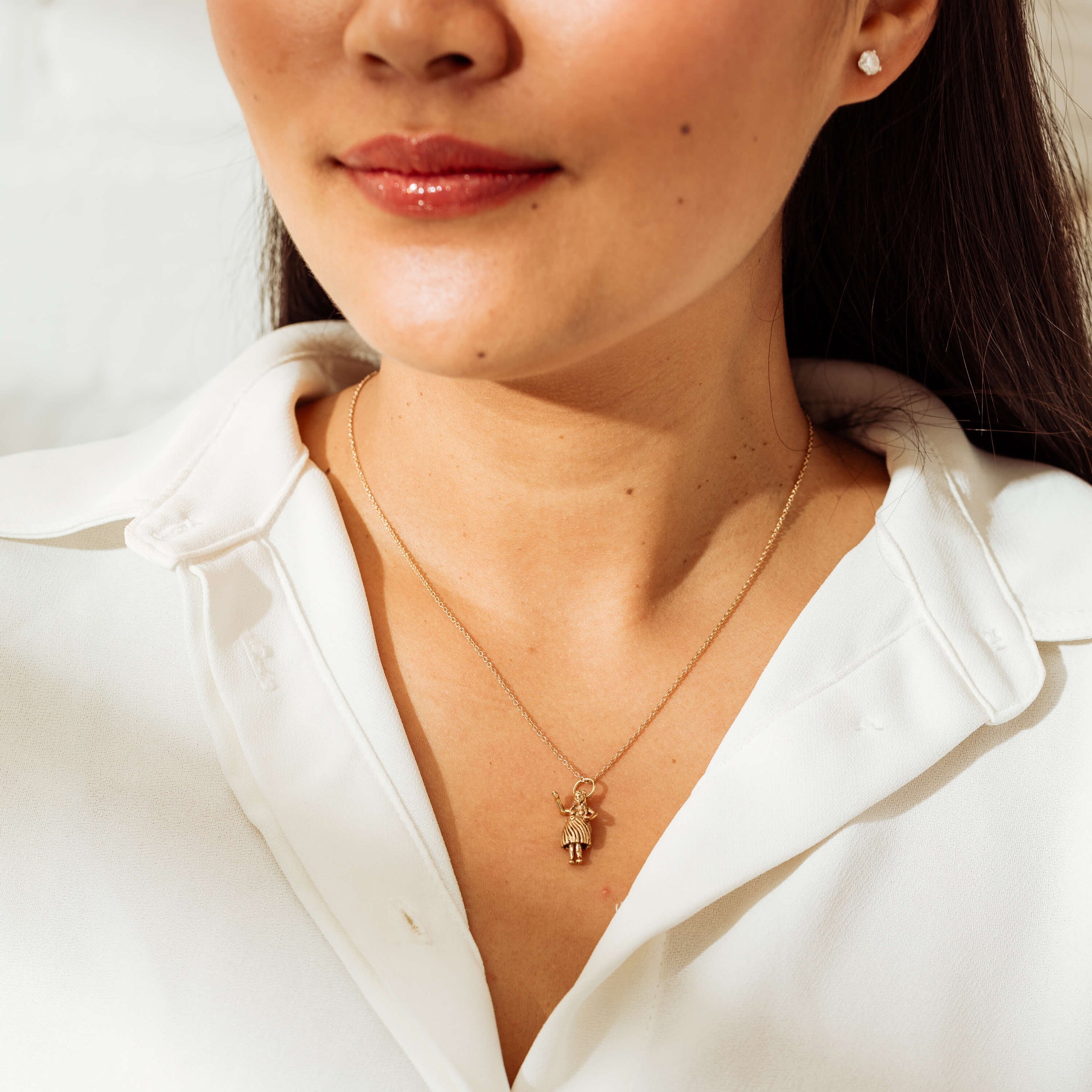 Bring a touch of island spirit with this 14ct Yellow Gold Hawaii Hula Dance Charm from our Deja Vu collection, featuring a beautifully detailed hula dancer crafted in 9ct yellow gold—her playful stance and traditional skirt capturing the joy and warmth of a classic Hawaiian celebration, making this a charming and meaningful piece.