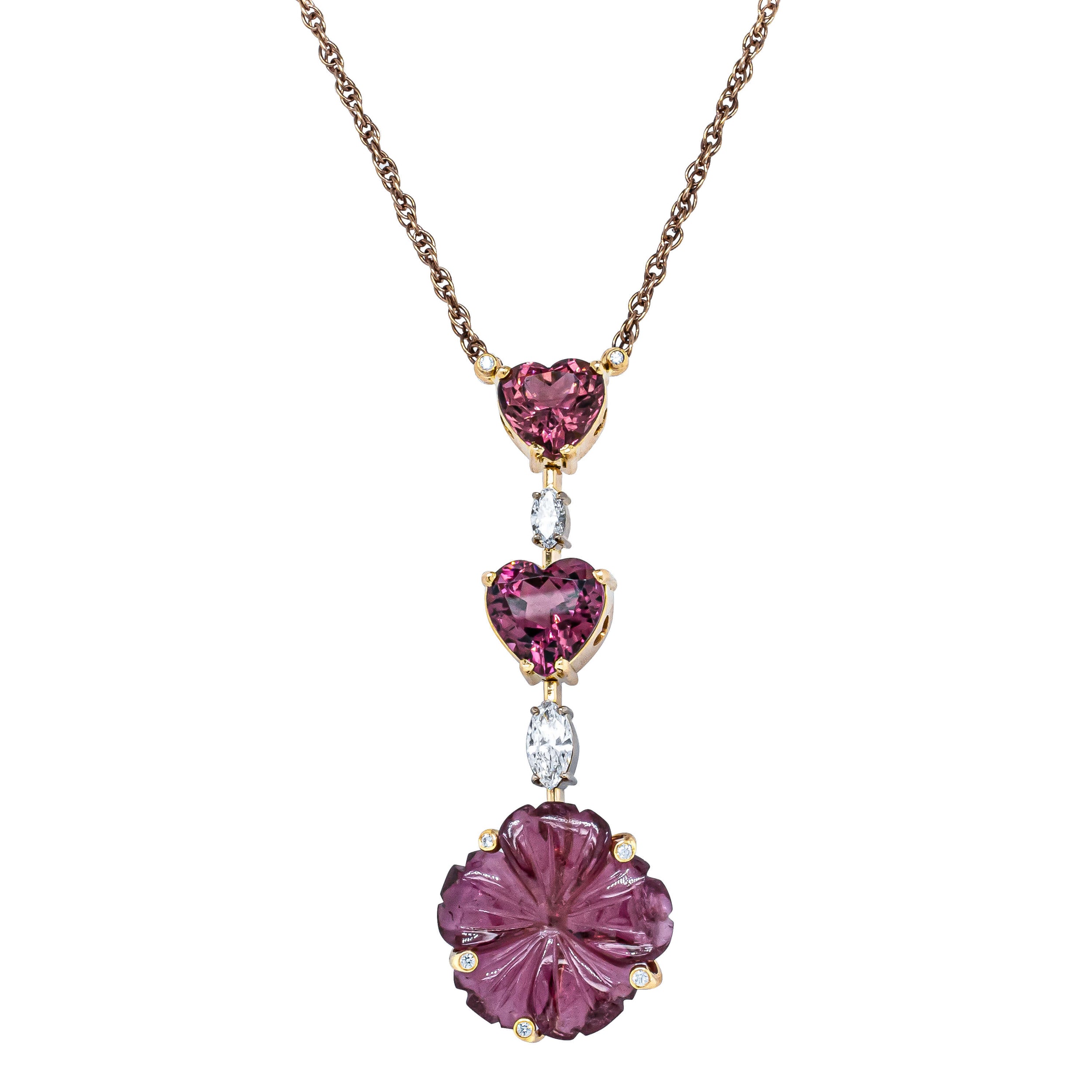 This 2000s Deja Vu 18ct tri-tone gold pendant is sure to set everyone in awe! This vibrant piece boasts varying cuts of tourmalines and diamonds, including a tourmaline bloom carving.