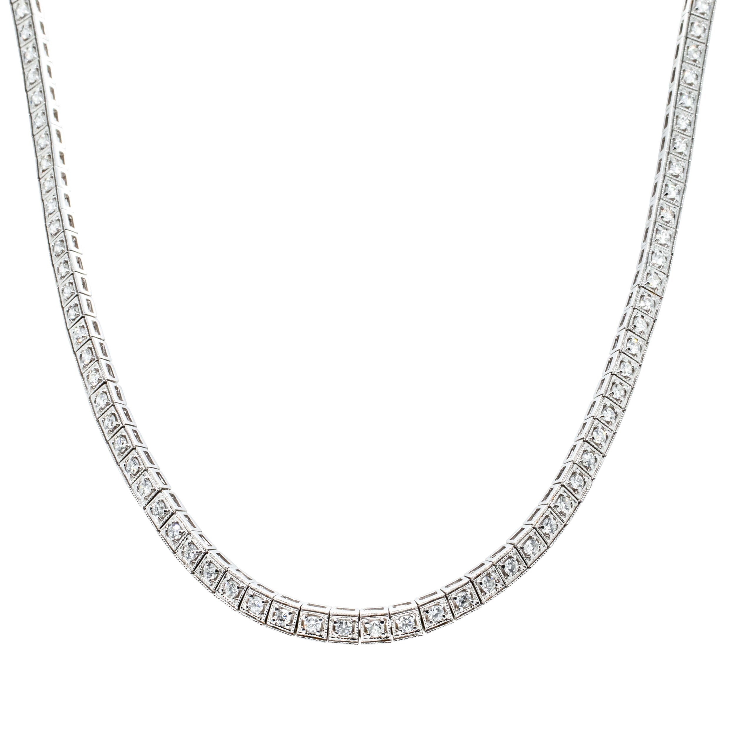 This 2000s Deja Vu diamond tennis necklace is crafted from 18ct white gold and boasts 114 round brilliant cut diamonds in wide square mount settings. A beautiful way to show special someone that they are loved.