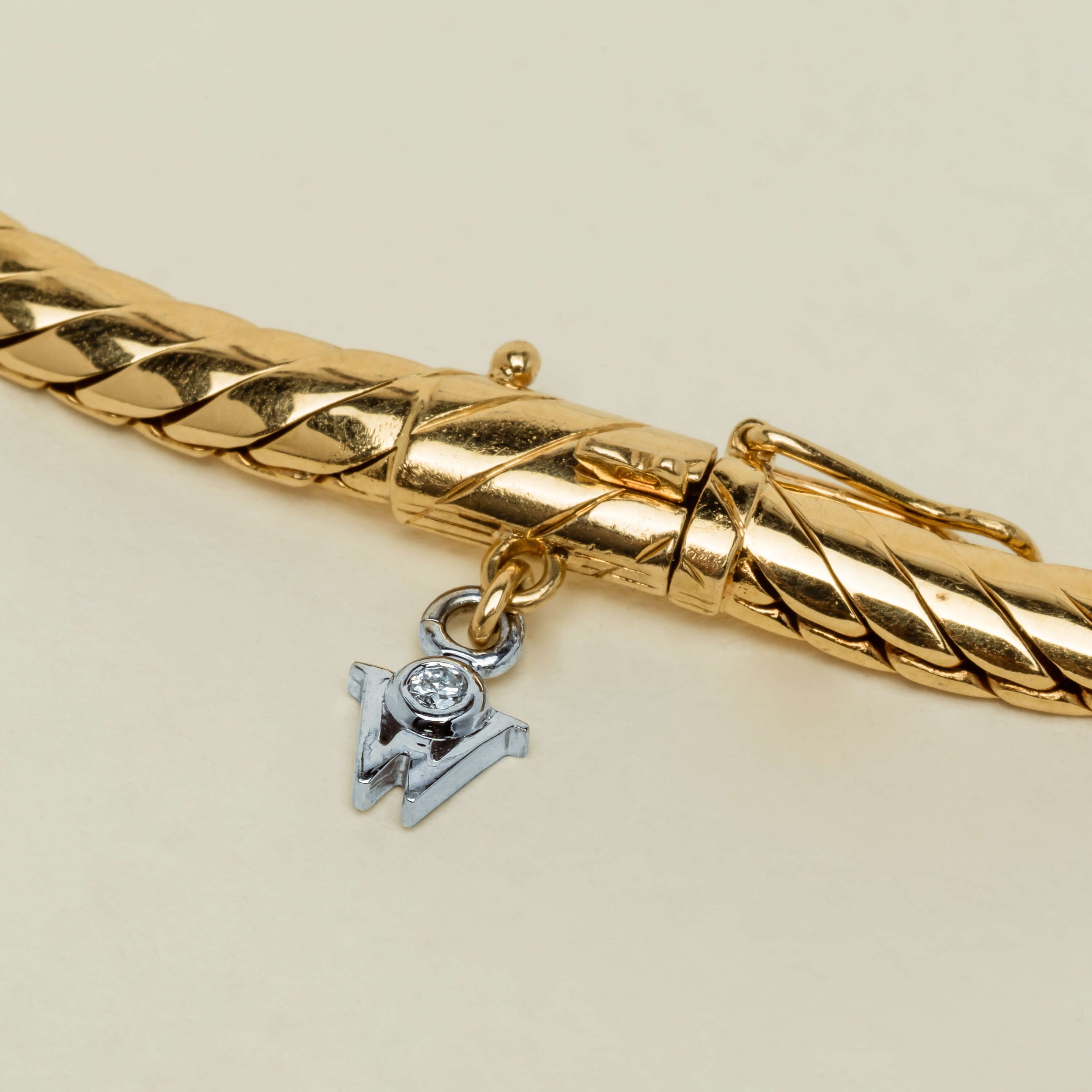 This necklace is securely fastened with a push-in clasp and safety catch, ensuring comfortable wear. A unique detail is the diamond-set 'W' pendant attached to the clasp, providing extra visual appeal. This piece blends timeless craftsmanship and contemporary glamour.