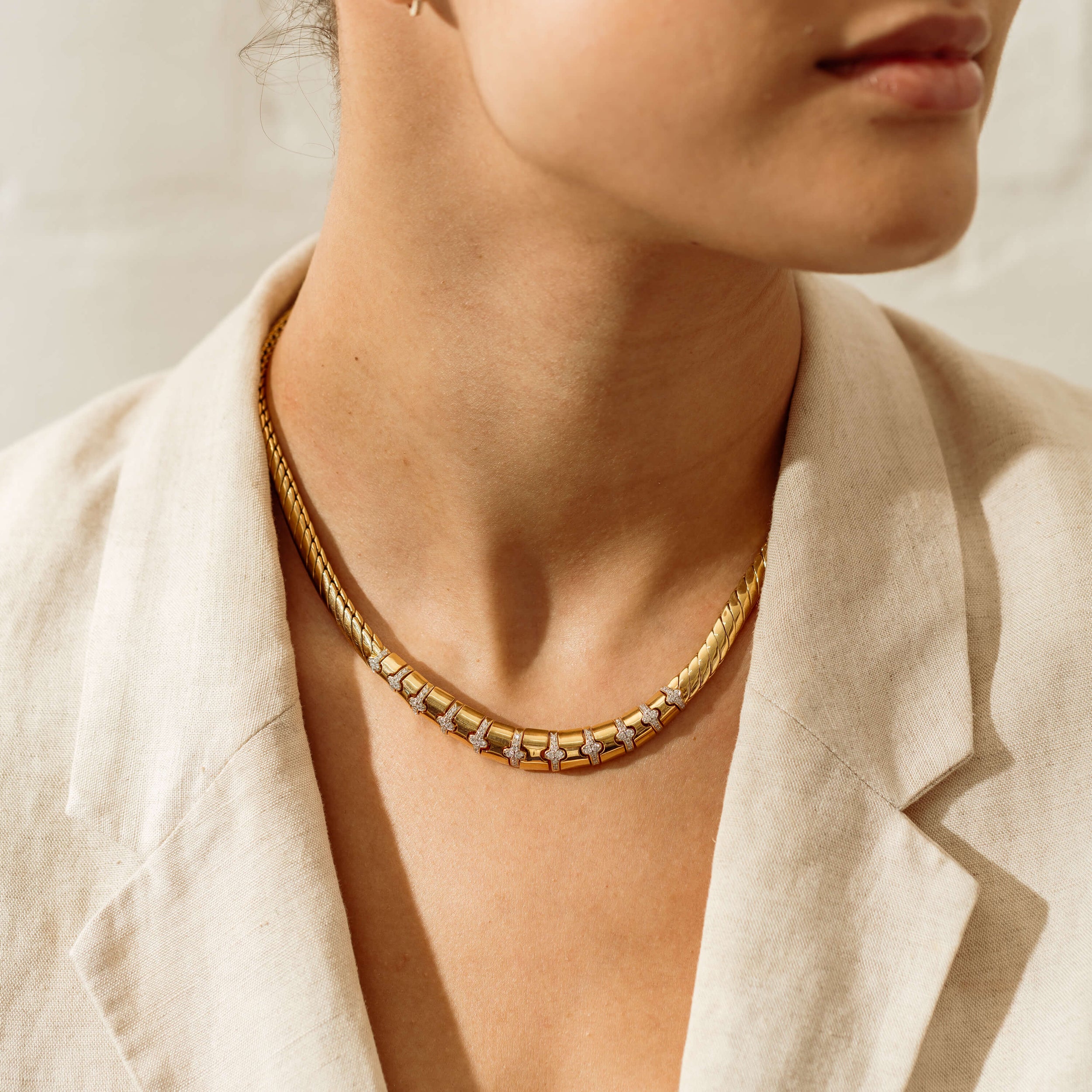 This 2000s Deja Vu 18ct Yellow Gold Diamond Necklace is a beautiful statement piece featuring a double tapering half-round chain crafted from 18ct yellow gold. Its elegant design is highlighted by a segmented central component, each section adorned with 1.00ct of round brilliant cut diamonds for stunning sparkle and sophistication.