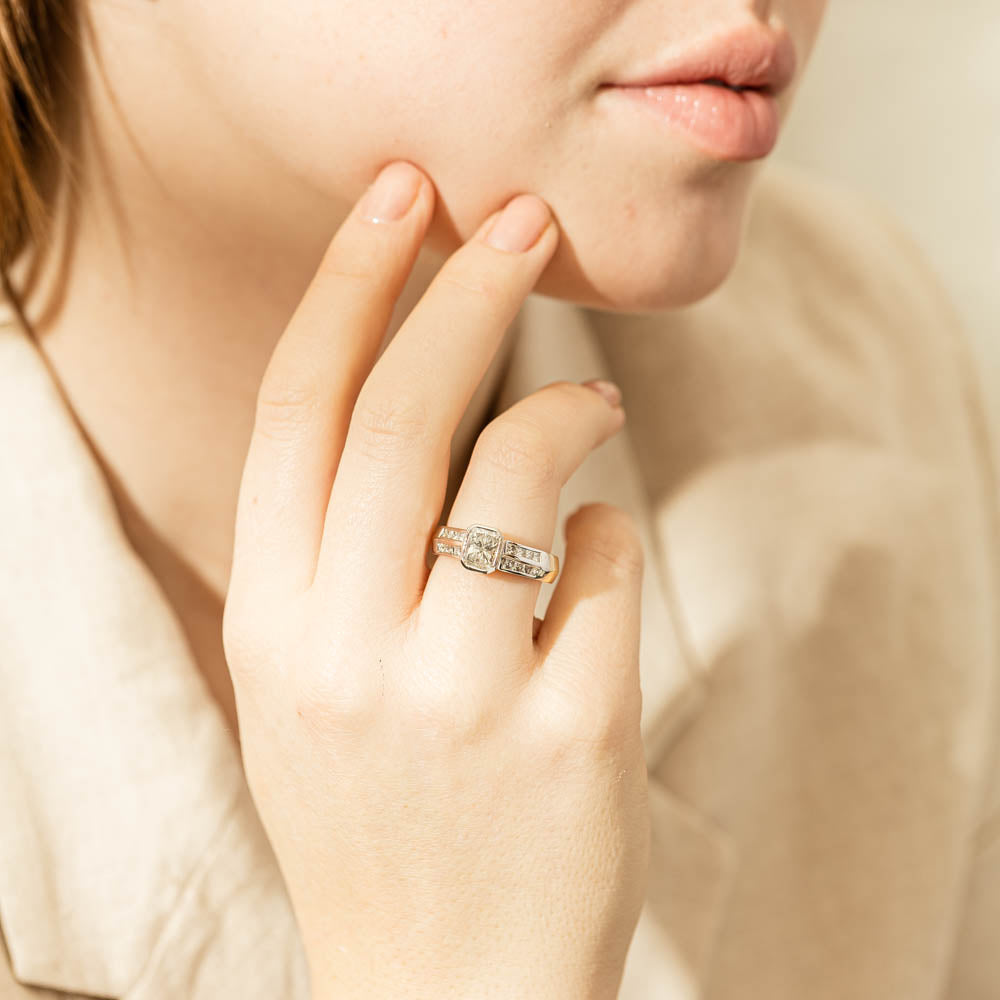 This 2000's Deja Vu ring is crafted from 18ct yellow gold and showcases a glimmering radiant cut diamond in a 18ct white gold rubover setting, accented by sixteen princess cut diamonds in channel set shoulders. This glamorous piece radiates timeless beauty, making it an absolute must-have.