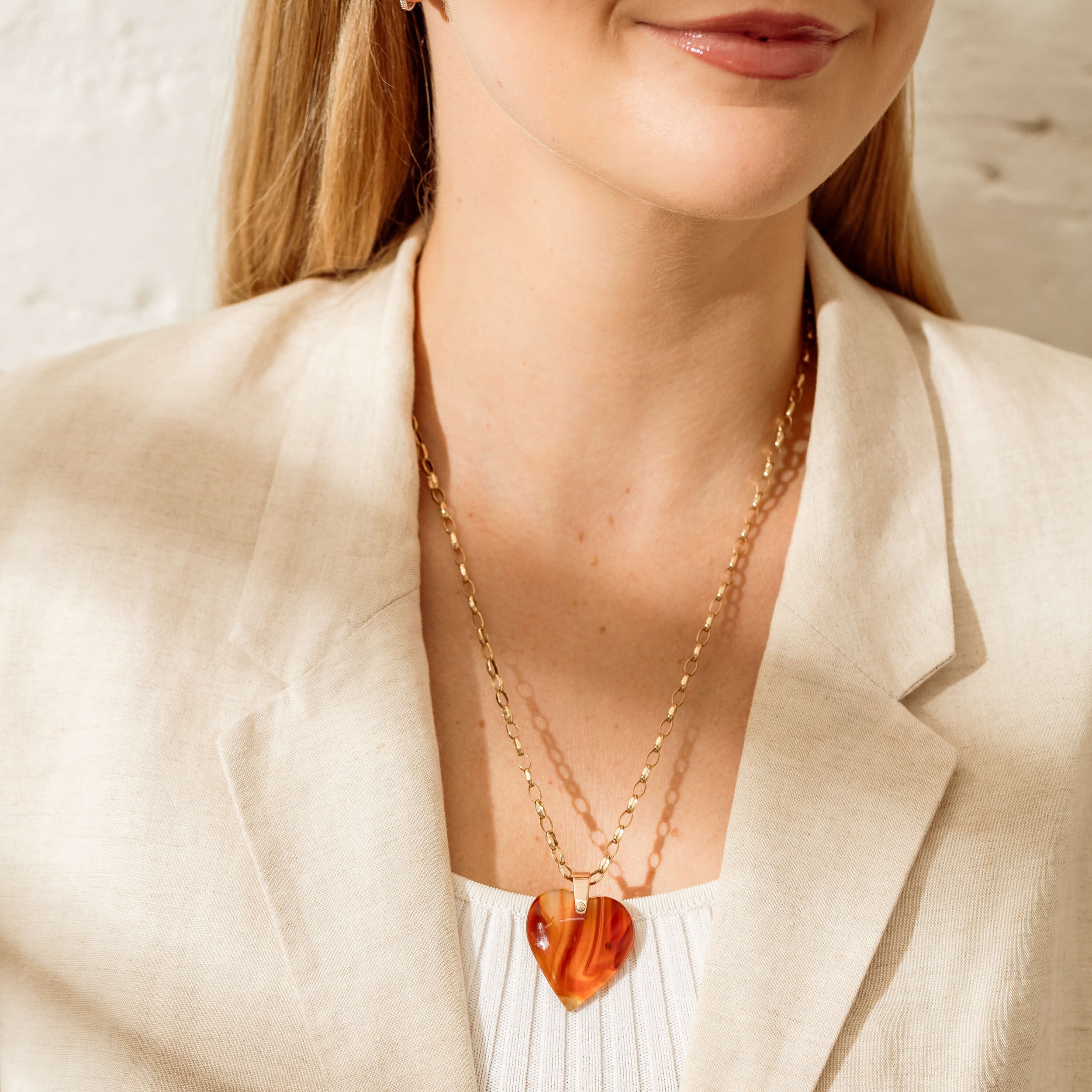 Make a statement with this stunning 9ct rose gold agate heart pendant from the 1930s. A bold Deja Vu piece perfect for any jewellery collection.
