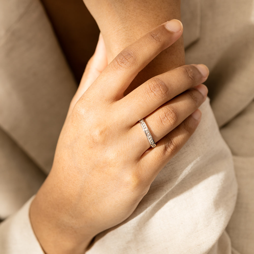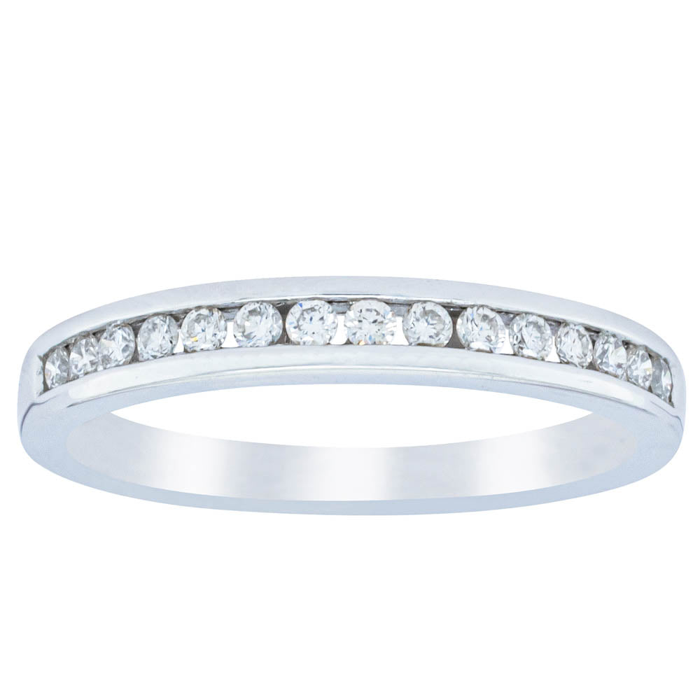Crafted in 9ct white gold, this beautiful band features fifteen channel set round brilliant cut diamonds. A dainty and elegant piece you will simply fall in love with.