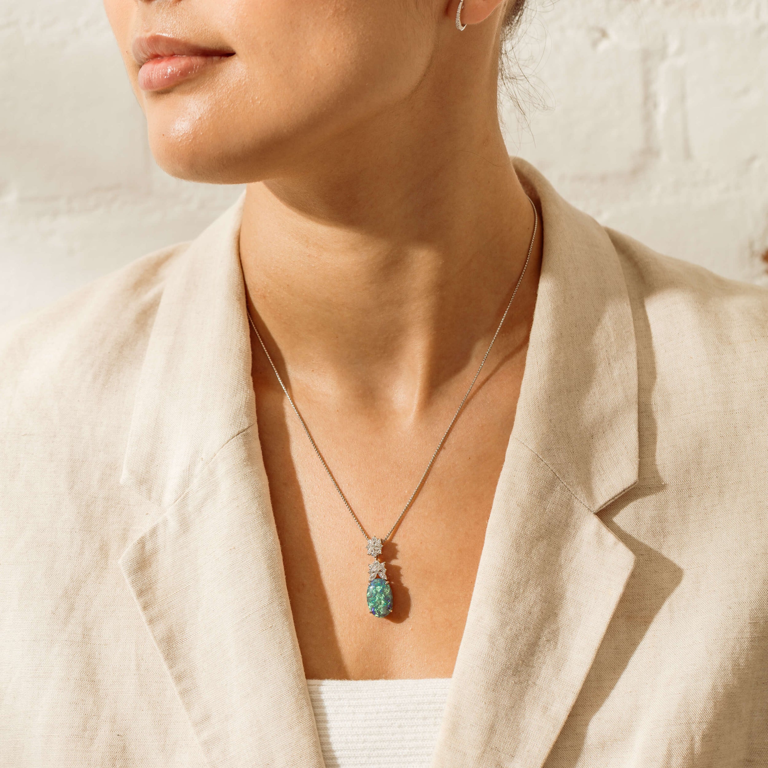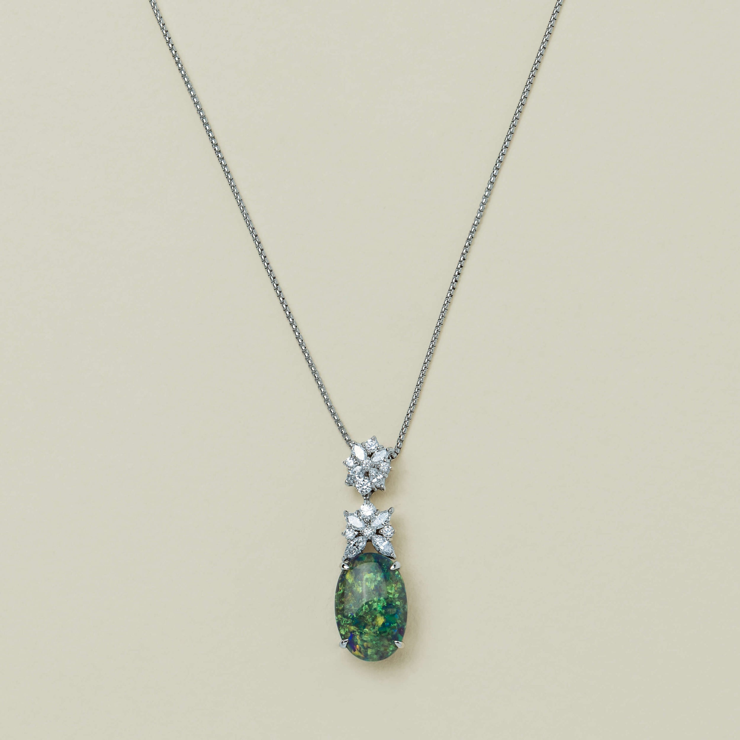 Enchanting and unique, this Deja Vu Platinum 4.11ct Opal & Diamond Pendant showcases mesmerizing colour and timeless luxury. At its heart rests a striking 4.11ct oval opal, revealing vibrant flashes of greens and blues as it moves with the light. This captivating stone is elegantly suspended from two diamond clusters of marquise and round brilliant cut diamonds, all set in luminous platinum for maximum brilliance and sophistication.