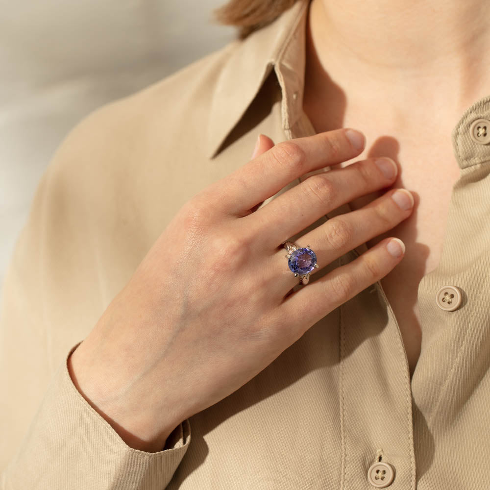 Simply spectacular.. this mesmerising tanzanite & diamond ring is sure to put a smile on your face! Crafted to perfection from luxurious platinum and 18ct yellow gold, this precious ring features a glamorous 5.60ct oval faceted tanzanite which tapers out to ribbed shoulders. Pure sophistication!