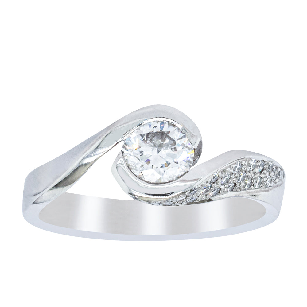 Admire this elegantly designed platinum ring that spirals to encase a glamourous round brilliant cut diamond and finished with pave set diamonds on one shoulder.