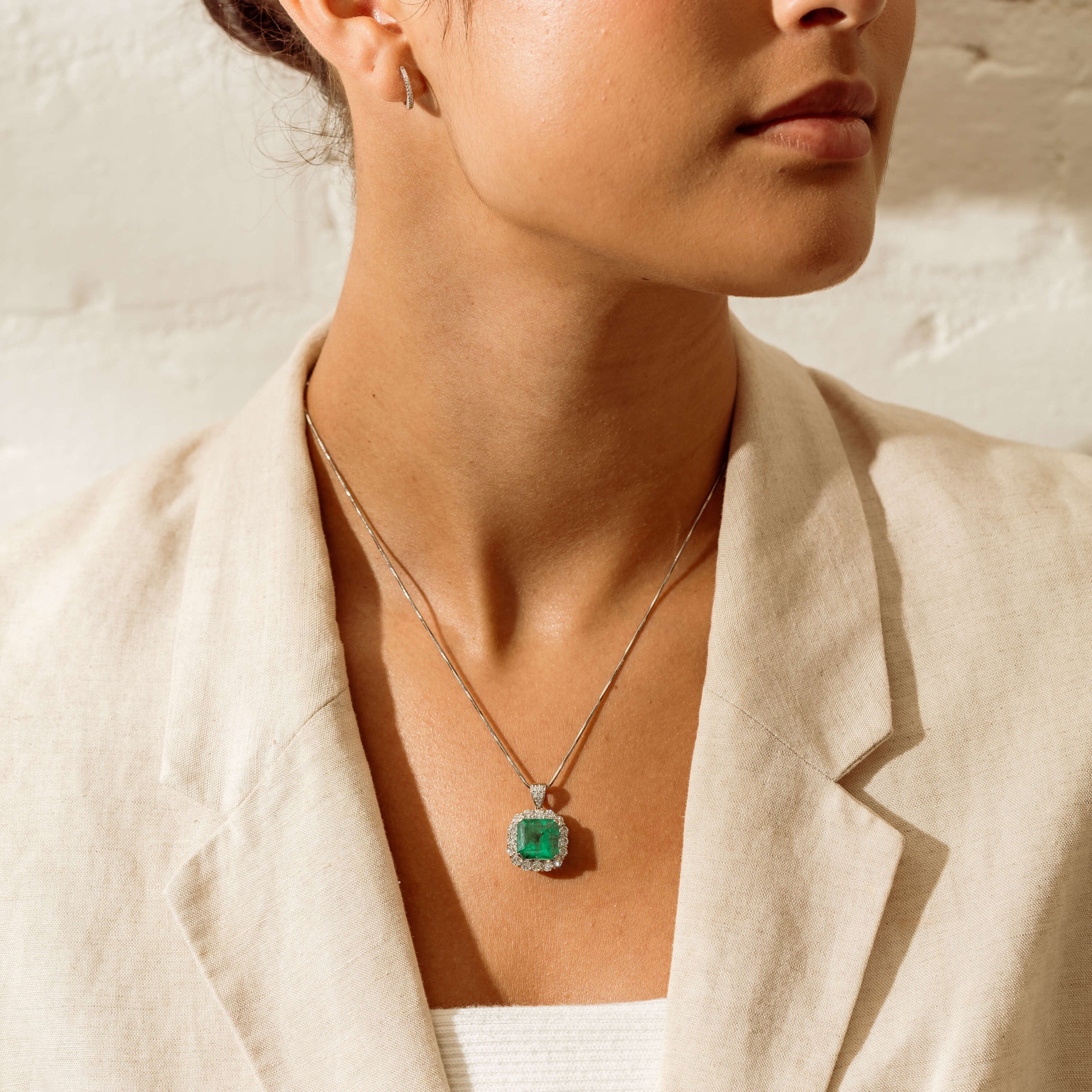 Enchanting and unique, this impressive Deja Vu 7.56ct Emerald & Diamond Pendant showcases mesmerizing colour and timeless luxury. At its heart rests a striking corner claw set 7.56ct step cut Emerald, showcasing its strong green hues as it moves with the light.