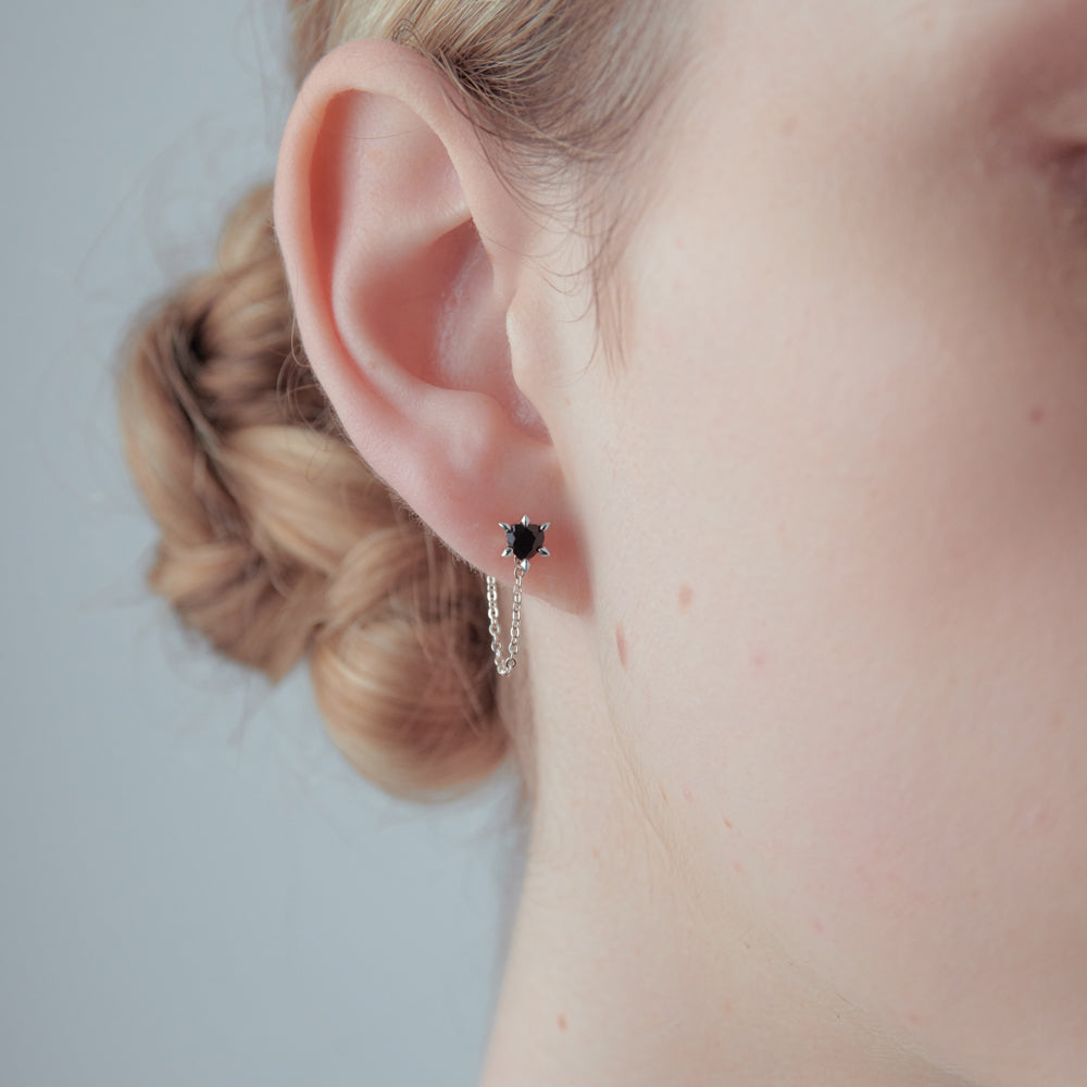 The sterling silver Cupid's Heart & Chain Studs each feature a mini claw-set onyx heart. From each daintily barbed heart dangles a fine chain, connected to a stud back, to lovingly wrap around the wearer's ear lobe.