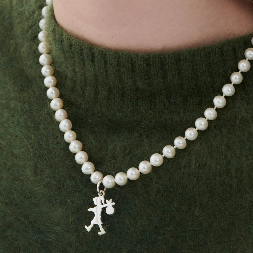 Combining timeless elegance with a fearless and intrepid spirit, a sterling silver Runaway Girl is suspended from a lustrous strand of white freshwater pearls for this fresh take on the classic pearl necklace.