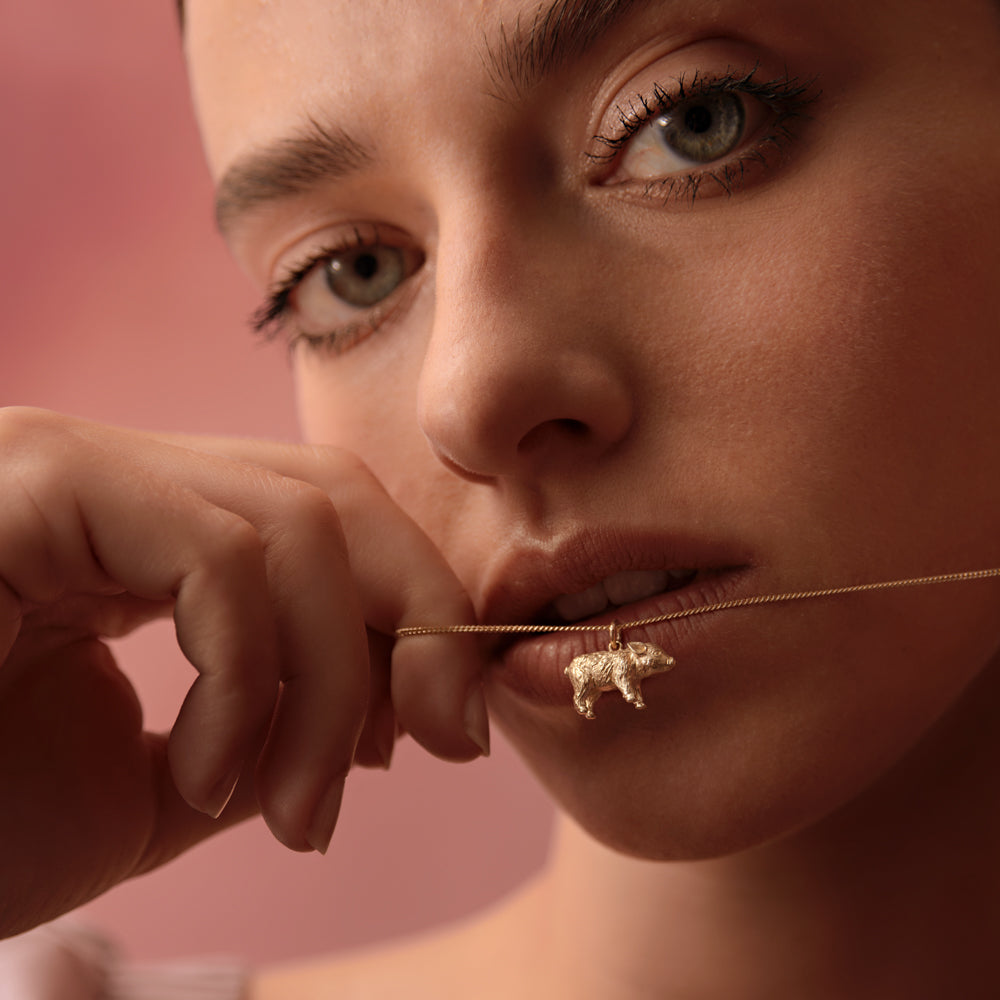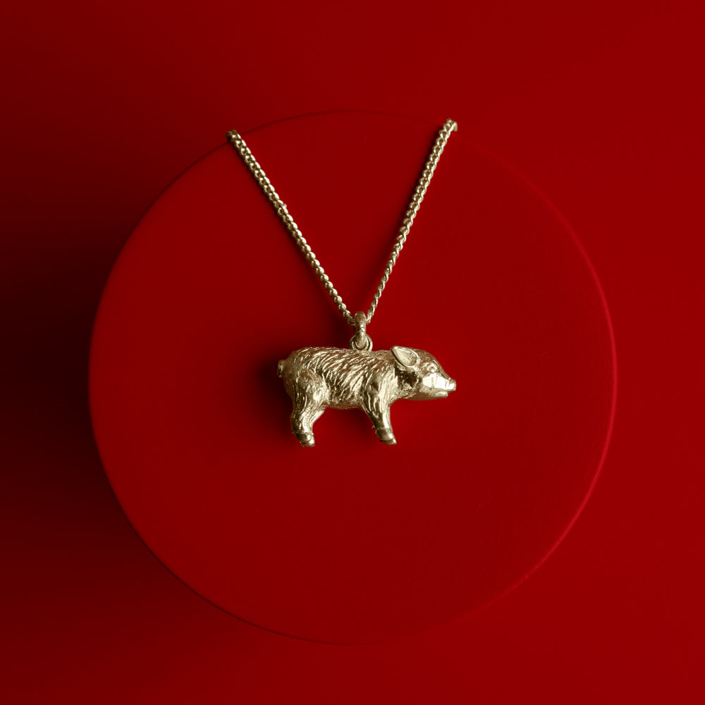 Exquisitely detailed with a fine adjustable chain, the sterling silver Pig Necklace is presented in a lucky red box, debossed with Karen Walker’s classic filigree design.