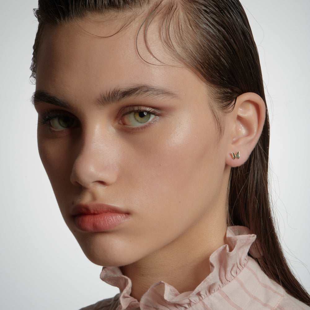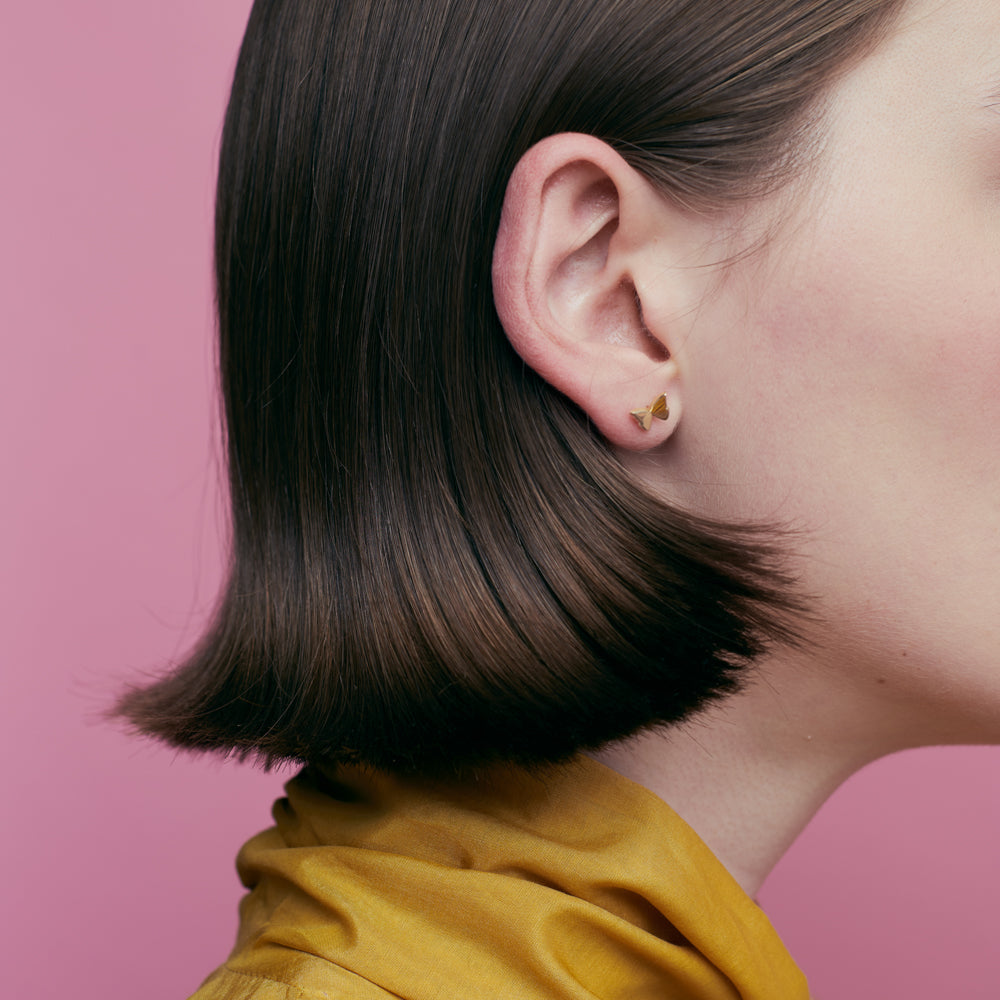 A pair of magical butterflies, paused mid-flight, find themselves in the form of sterling silver stud earrings of Lilliputian scale.