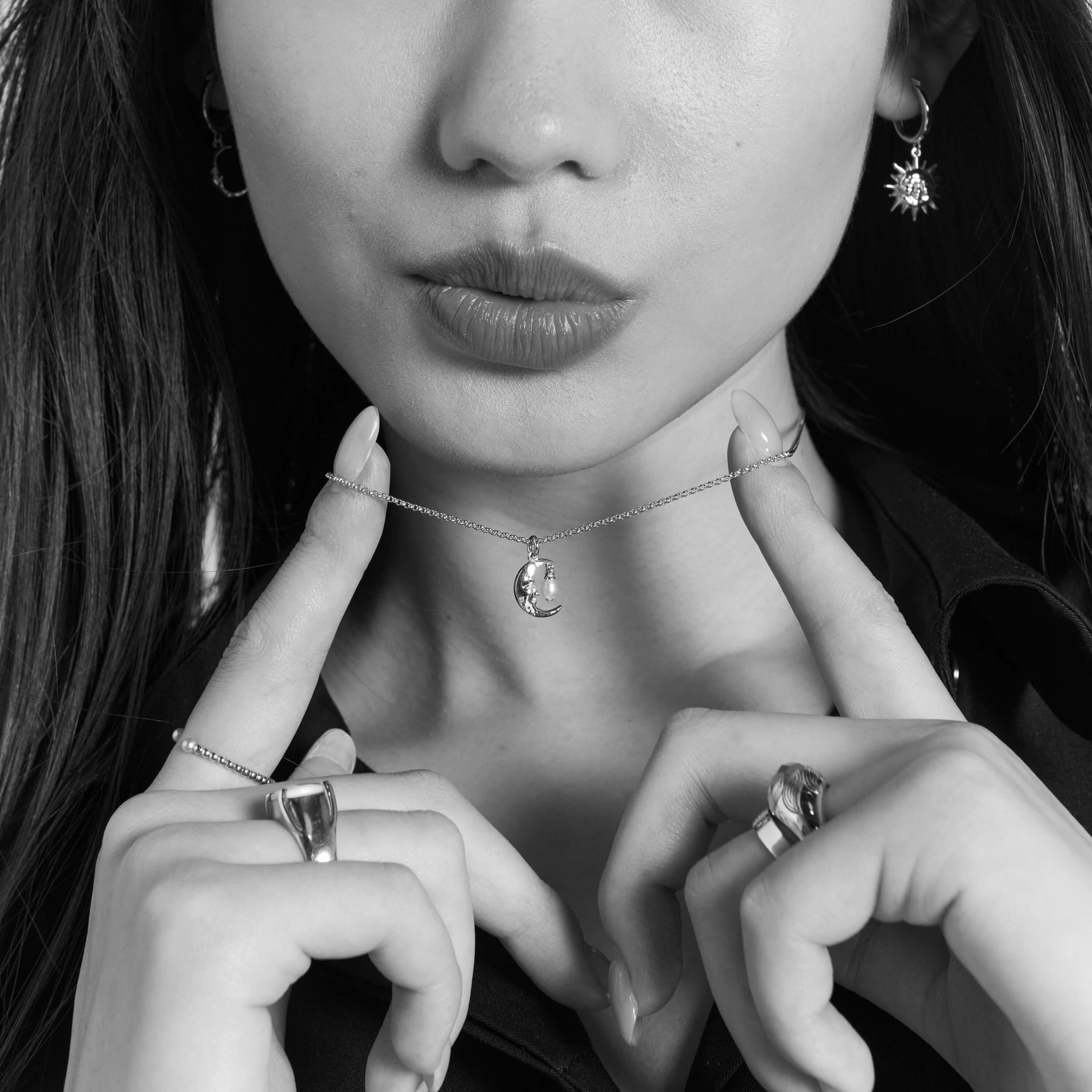 A soft whisper of night and mystery, this necklace features a serene crescent moon cradling a glowing pearl. With fine etching and an emotive, human-like face, the moon radiates calm and quiet strength. The pearl, nestled like a drop of starlight, adds gentle luminosity.