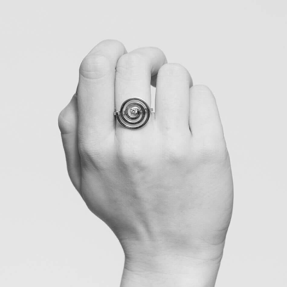 This ring has a square band with a bridge up to a flat surfaced spiral in gold, set with a single stone in the centre.