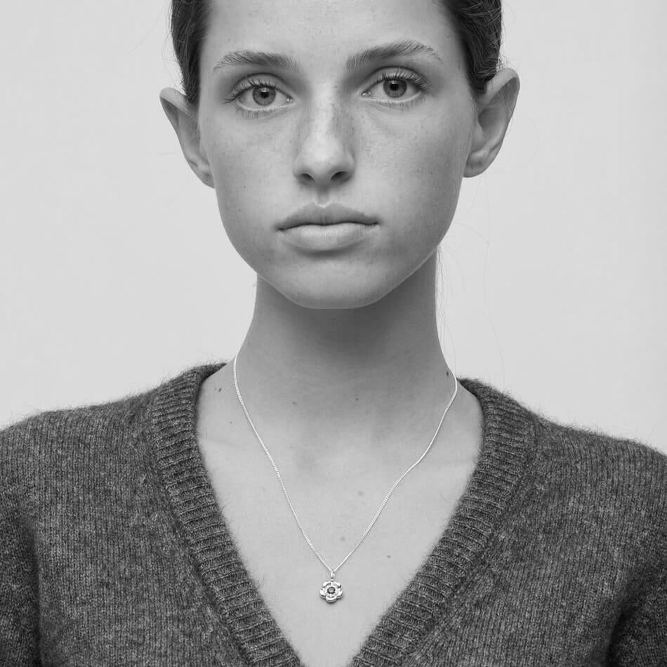 A single floral charm, centred with a brilliant cut stone, hangs from a fine chain – a delicate tribute to the poetry of nature and the constancy of change.