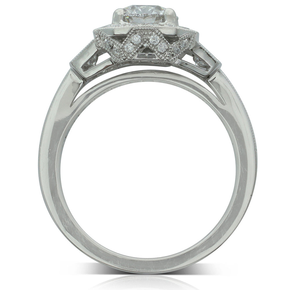 Wow her with this magnificent ring. Boasting an impressive round brilliant cut diamond framed by a glittering diamond halo, she will be swept off her feet with this dazzling ring.