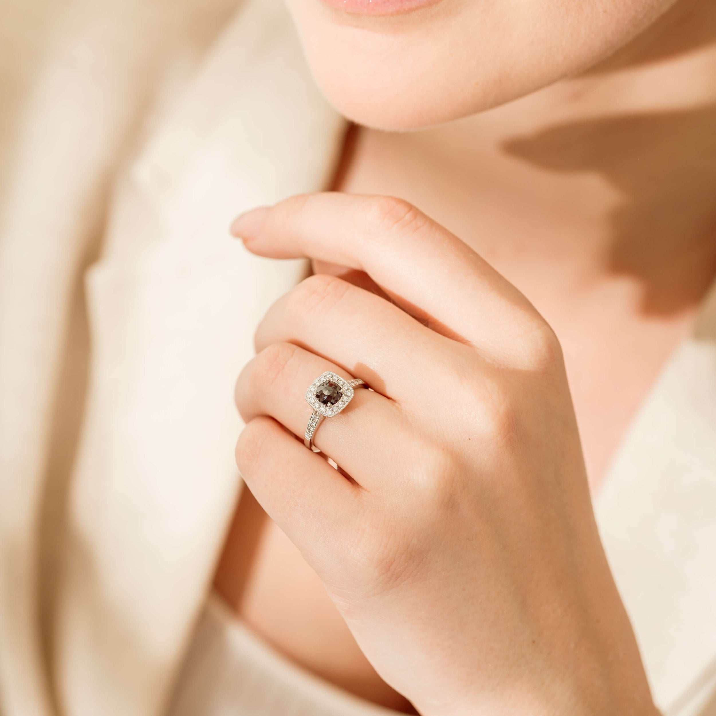 This exceptional Aurora ring from our signature 1899 collection boasts one rose cut centre black diamond. Dainty white diamonds create a halo around the centre diamond, and are also set along the band and the base of the cluster. This special ring is carefully crafted to perfection from platinum.