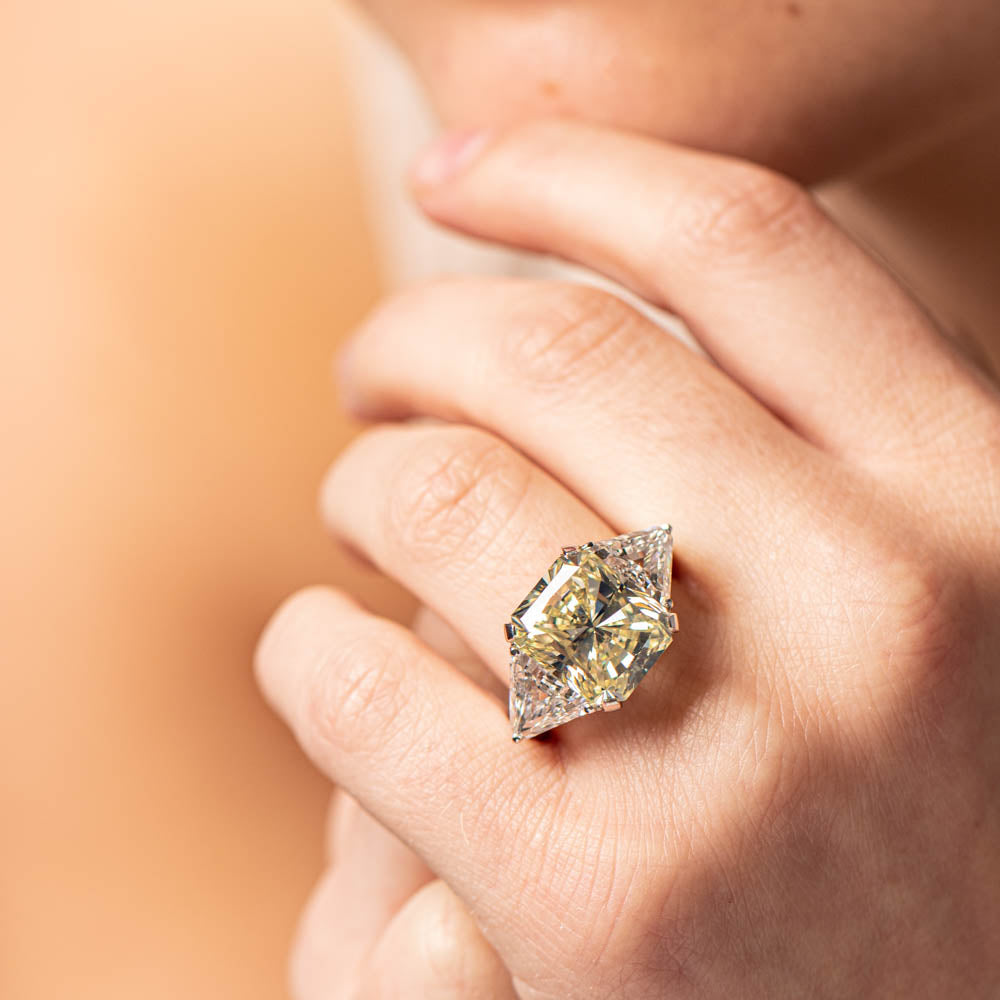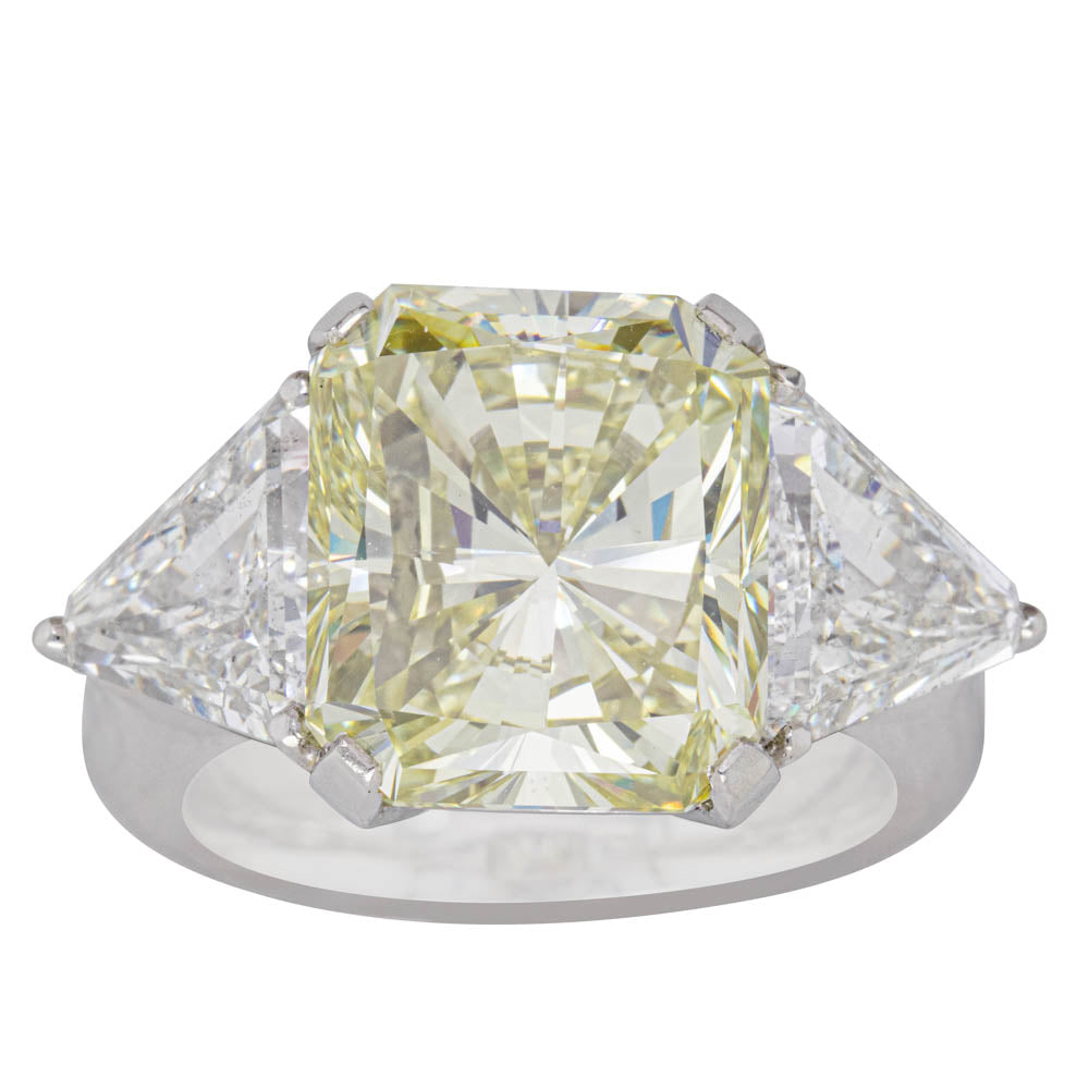Exceptionally crafted, this diamond ring showcases two beautifully matched trilliant cut diamonds claw-set in platinum to frame a stunning radiant cut yellow diamond.