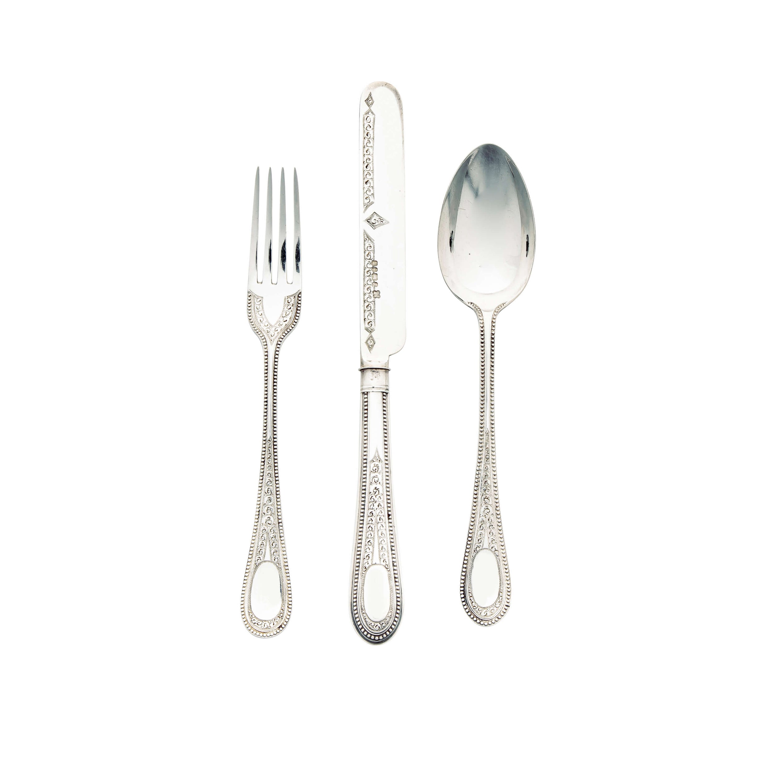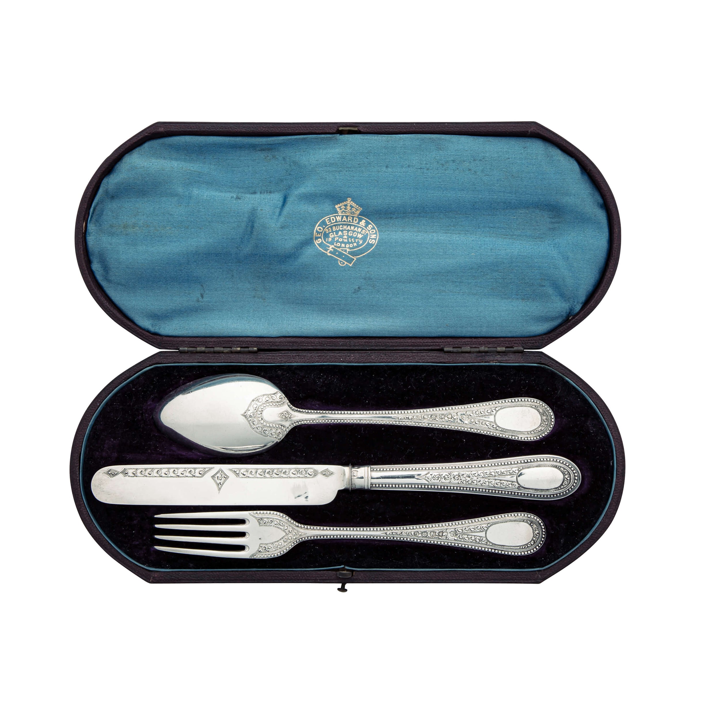 This Victorian sterling silver three-piece child's cutlery set includes a fork, knife, and spoon - embellished with engraved scroll and beaded edge decoration. It is hallmarked with Sheffield 1877, with makers marks of 'Martin, Hall & Co'. Packaged in original box.
